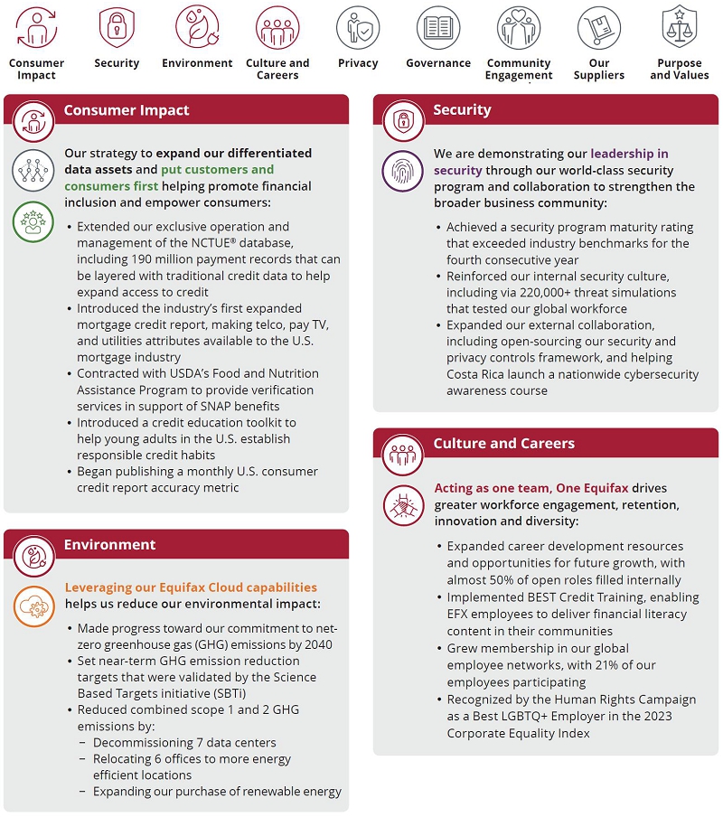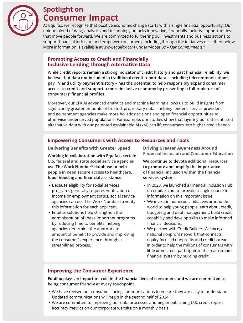 We believe that helping people live their financial best starts with helping consumers increase their financial capability. We are committed to providing broader credit education, helping people understand both their personal finances and the credit system as well as the role we play in helping to provide access to mainstream, sustainable financial products. • The experience of our more than 20 million myEquifax™ users and 7 million Core Credit™ subscribers continues to evolve in the U.S. to include access to new offers and services. • We reviewed and revised all written U.S. consumer communications – information sent from Equifax by email or the U.S. Postal Service outside of the dispute process – to ensure that they are easy for consumers to understand. Updated communications will begin in the second half of 2024. • Building on our commitment to education, we supplemented our robust online consumer Knowledge Center with the launch of a new consumer credit video education series, “Equifax Learn”, on YouTube to help explain U.S. credit scores, credit reports, and answer consumers’ most asked questions. • And, our USIS team, along with The Credit Builders Alliance (CBA) and The Annie E. Casey Foundation, introduced a national credit education toolkit to help young adults in the U.S. build credit capability at an early age. |