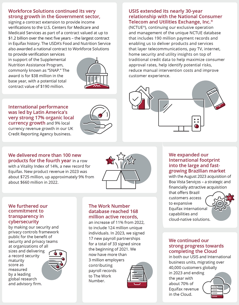 2023 was an energizing year for the New Equifax. As we move closer to completing the Equifax Cloud™ we are pivoting from building to leveraging our new Cloud capabilities, single data fabric, differentiated data, and EFX.AI Artificial Intelligence (AI) capabilities to deliver new solutions for customers and consumers in each of the 24 markets we serve. As we mark our 125-year anniversary in 2024, we are celebrating a culture of continuous innovation as the New Equifax that drives top and bottom line growth and delivers strong financial results for our shareholders.