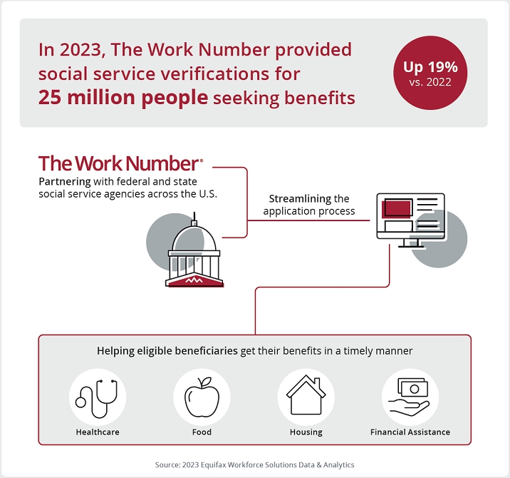 Working in collaboration with Equifax, U.S. federal and state social service agencies use The Work Number to help people in need secure access to healthcare, food, housing, and financial assistance. In 2023, The Work Number provided social service verifications for 25 million people seeking benefits – a 19% increase from 2022. Some of these programs include Medicaid, SNAP, Temporary Assistance for Needy Families (TANF), Housing Choice Vouchers, Supplemental Security Income (SSI), and more.