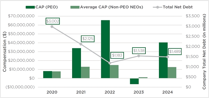 | • | The annual incentive plan for 2024 also included other metrics we felt were key to value creation, including operational strategy (disciplined capital expenditures and production volume), leverage goals, and cash cost containment. The Compensation Committee determined that the 2024 Annual Incentive Plan should pay out in accordance with the pre-established formula and did not adjust any payouts in 2024. The achieved payout was 186.9% of target. The full details of our annual incentive plan metrics, goals and results are shown on page 43 of the proxy. |