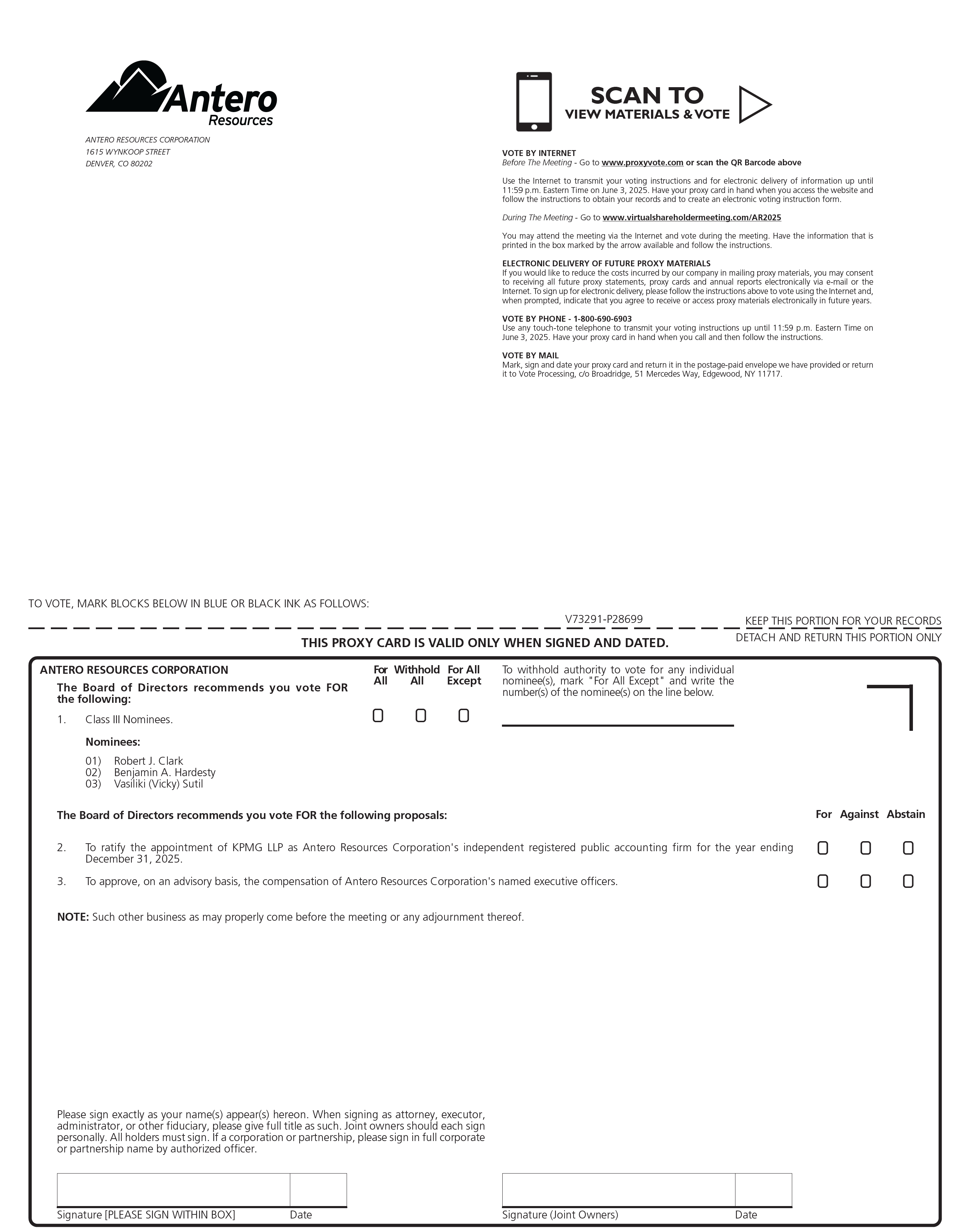 SCAN TO VIEW MATERIALS & VOTE ANTERO RESOURCES CORPORATION 1615 WYNKOOP STREET DENVER, CO 80202 VOTE BY INTERNET Before The Meeting - Go to www.proxyvote.com or scan the QR Barcode above Use the Internet to transmit your voting instructions and for electronic delivery of information up until 11:59 p.m. Eastern Time on June 3, 2025. Have your proxy card in hand when you access the website and follow the instructions to obtain your records and to create an electronic voting instruction form. During The Meeting -Go to www.virtualshareholdermeeting.com/AR2025 You may attend the meeting via the Internet and vote during the meeting. Have the information that is printed in the box marked by the arrow available and follow the instructions. ELECTRONIC DELIVERY OF FUTURE PROXY MATERIALS If you would like to reduce the costs incurred by our company in mailing proxy materials, you may consent to receiving all future proxy statements, proxy cards and annual reports electronically via e-mail or the Internet. To sign up for electronic delivery, please follow the instructions above to vote using the Internet and, when prompted, indicate that you agree to receive or access proxy materials electronically in future years. VOTE BY PHONE - 1-800-690-6903 Use any touch-tone telephone to transmit your voting instructions up until 11:59 p.m. Eastern Time on June 3, 2025. Have your proxy card in hand when you call and then follow the instructions. VOTE BY MAIL Mark, sign and date your proxy card and return it in the postage-paid envelope we have provided or return it to Vote Processing, c/o Broadridge, 51 Mercedes Way, Edgewood, NY 11717. TO VOTE, MARK BLOCKS BELOW IN BLUE OR BLACK INK AS FOLLOWS: V73291-P28699 KEEP THIS PORTION FOR YOUR RECORDS THIS PROXY CARD IS VALID ONLY WHEN SIGNED AND DATED. DETACH AND RETURN THIS PORTION ONLY ANTERO RESOURCES CORPORATION For Withhold For All To withhold authority to vote for any individual All All Except nominee(s), mark "For All Except" and write the The Board of Directors recommends you vote FOR number(s) of the nominee(s) on the line below. the following: 1. Class III Nominees. Nominees: 01) Robert J. Clark 02) Benjamin A. Hardesty 03) Vasiliki (Vicky) Sutil The Board of Directors recommends you vote FOR the following proposals: For Against Abstain 2. To ratify the appointment of KPMG LLP as Antero Resources Corporation's independent registered public accounting firm for the year ending December 31, 2025. 3. To approve, on an advisory basis, the compensation of Antero Resources Corporation's named executive officers. NOTE: Such other business as may properly come before the meeting or any adjournment thereof. Please sign exactly as your name(s) appear(s) hereon. When signing as attorney, executor, administrator, or other fiduciary, please give full title as such. Joint owners should each sign personally. All holders must sign. If a corporation or partnership, please sign in full corporate or partnership name by authorized officer. Signature [PLEASE SIGN WITHIN BOX] Date Signature (Joint Owners) Date