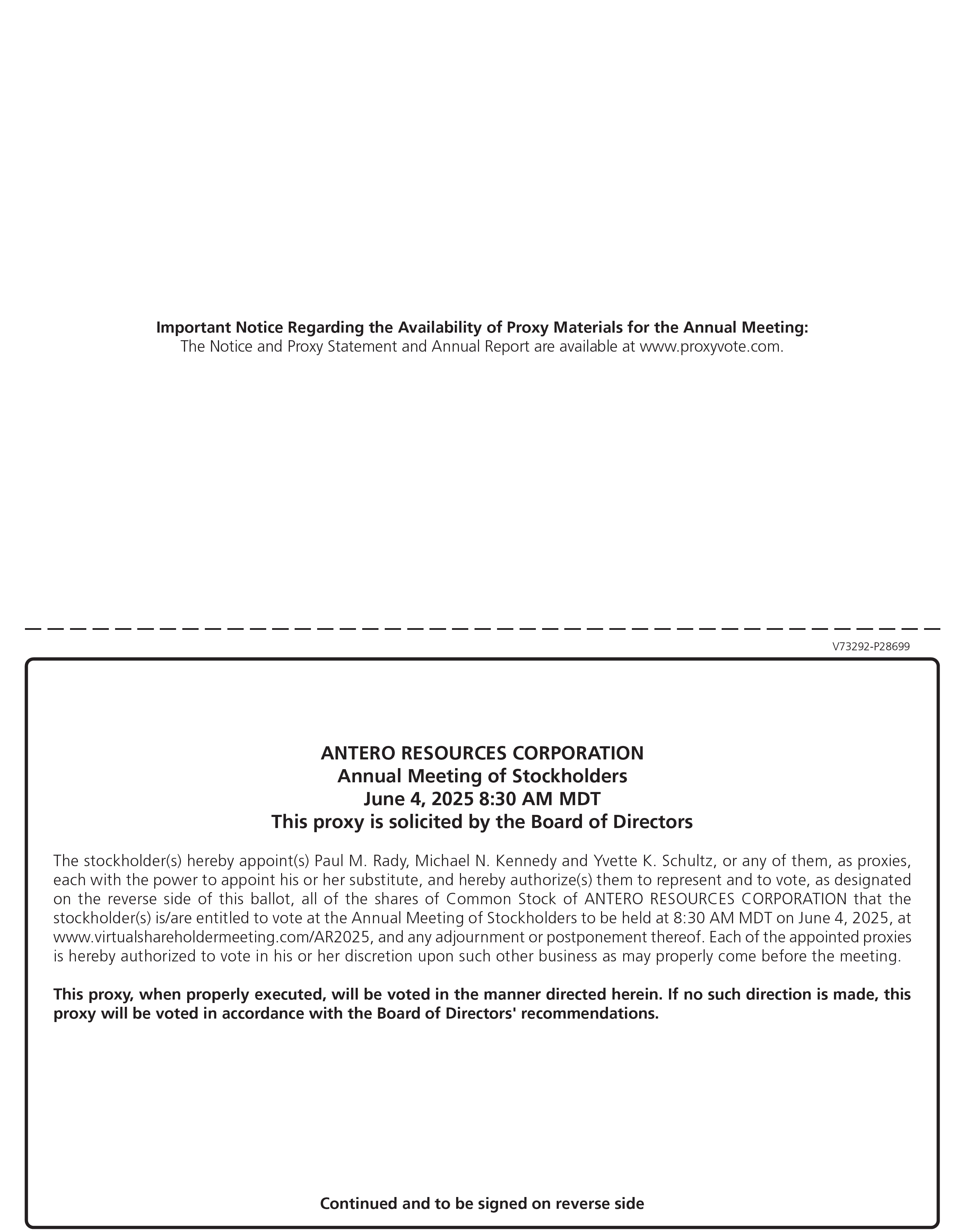 Important Notice Regarding the Availability of Proxy Materials for the Annual Meeting: The Notice and Proxy Statement and Annual Report are available at www.proxyvote.com. V73292-P28699 ANTERO RESOURCES CORPORATION Annual Meeting of Stockholders June 4, 2025 8:30 AM MDT This proxy is solicited by the Board of Directors The stockholder(s) hereby appoint(s) Paul M. Rady, Michael N. Kennedy and Yvette K. Schultz, or any of them, as proxies, each with the power to appoint his or her substitute, and hereby authorize(s) them to represent and to vote, as designated on the reverse side of this ballot, all of the shares of Common Stock of ANTERO RESOURCES CORPORATION that the stockholder(s) is/are entitled to vote at the Annual Meeting of Stockholders to be held at 8:30 AM MDT on June 4, 2025, at www.virtualshareholdermeeting.com/AR2025, and any adjournment or postponement thereof. Each of the appointed proxies is hereby authorized to vote in his or her discretion upon such other business as may properly come before the meeting. This proxy, when properly executed, will be voted in the manner directed herein. If no such direction is made, this proxy will be voted in accordance with the Board of Directors' recommendations. Continued and to be signed on reverse side