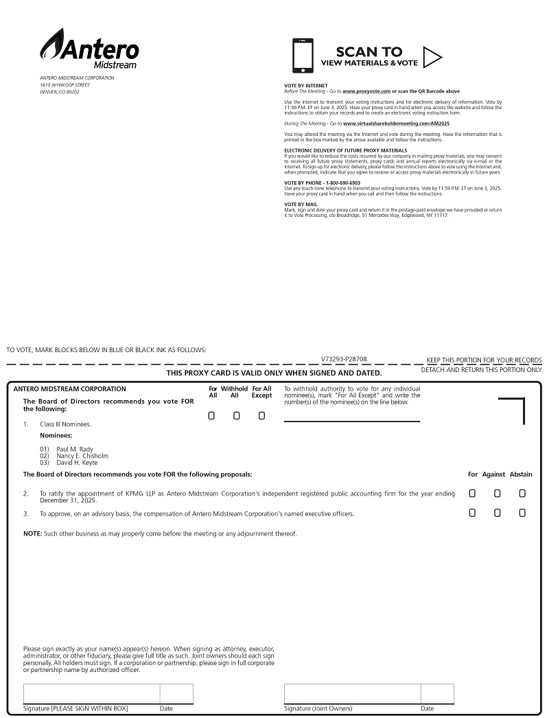 ANTERO MIDSTREAM CORPORATION 1615 WYNKOOP STREET DENVER, CO 80202 SCAN TO VIEW MATERIALS & VOTE VOTE BY INTERNET Before The Meeting - Go to www.proxyvote.com or scan the QR Barcode above Use the Internet to transmit your voting instructions and for electronic delivery of information. Vote by 11:59 P.M. ET on June 3, 2025. Have your proxy card in hand when you access the website and follow the instructions to obtain your records and to create an electronic voting instruction form. During The Meeting - Go to www.virtualshareholdermeeting.com/AM2025 You may attend the meeting via the Internet and vote during the meeting. Have the information that is printed in the box marked by the arrow available and follow the instructions. ELECTRONIC DELIVERY OF FUTURE PROXY MATERIALS If you would like to reduce the costs incurred by our company in mailing proxy materials, you may consent to receiving all future proxy statements, proxy cards and annual reports electronically via e-mail or the Internet. To sign up for electronic delivery, please follow the instructions above to vote using the Internet and, when prompted, indicate that you agree to receive or access proxy materials electronically in future years. VOTE BY PHONE - 1-800-690-6903 Use any touch-tone telephone to transmit your voting instructions. Vote by 11:59 P.M. ET on June 3, 2025. Have your proxy card in hand when you call and then follow the instructions. VOTE BY MAIL Mark, sign and date your proxy card and return it in the postage-paid envelope we have provided or return it to Vote Processing, c/o Broadridge, 51 Mercedes Way, Edgewood, NY 11717. TO VOTE, MARK BLOCKS BELOW IN BLUE OR BLACK INK AS FOLLOWS: V73293-P28708 KEEP THIS PORTION FOR YOUR RECORDS THIS PROXY CARD IS VALID ONLY WHEN SIGNED AND DATED. DETACH AND RETURN THIS PORTION ONLY ANTERO MIDSTREAM CORPORATION 1. Class III Nominees. Nominees: The Board of Directors recommends you vote FOR the following 01) Paul M. Rady 02) Nancy E. Chisholm 03) David H. Keyte For All Withhold All For All Except To withhold authority to vote for any individual nominee(s), mark "For All Except" and write the number(s) of the nominee(s) on the line below The Board of Directors recommends you vote FOR the following proposals: 2. To ratify the appointment of KPMG LLP as Antero Midstream Corporation's independent registered public accounting firm for the year ending December 31, 2025. 3. To approve, on an advisory basis, the compensation of Antero Midstream Corporation's named executive officers. NOTE: Such other business as may properly come before the meeting or any adjournment thereof. For Against Abstain Please sign exactly as your name(s) appear(s) hereon. When signing as attorney, executor, administrator, or other fiduciary, please give full title as such. Joint owners should each sign personally. All holders must sign. If a corporation or partnership, please sign in full corporate or partnership name by authorized officer. Signature [PLEASE SIGN WITHIN BOX] Date Signature (Joint Owners) Date