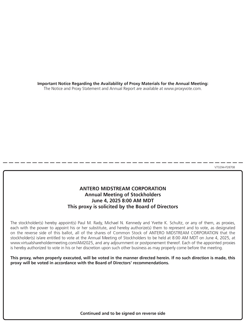 Important Notice Regarding the Availability of Proxy Materials for the Annual Meeting: The Notice and Proxy Statement and Annual Report are available at www.proxyvote.com. V73294-P28708 ANTERO MIDSTREAM CORPORATION Annual Meeting of Stockholders June 4, 2025 8:00 AM MDT This proxy is solicited by the Board of Directors The stockholder(s) hereby appoint(s) Paul M. Rady, Michael N. Kennedy and Yvette K. Schultz, or any of them, as proxies, each with the power to appoint his or her substitute, and hereby authorize(s) them to represent and to vote, as designated on the reverse side of this ballot, all of the shares of Common Stock of ANTERO MIDSTREAM CORPORATION that the stockholder(s) is/are entitled to vote at the Annual Meeting of Stockholders to be held at 8:00 AM MDT on June 4, 2025, at www.virtualshareholdermeeting.com/AM2025, and any adjournment or postponement thereof. Each of the appointed proxies is hereby authorized to vote in his or her discretion upon such other business as may properly come before the meeting. This proxy, when properly executed, will be voted in the manner directed herein. If no such direction is made, this proxy will be voted in accordance with the Board of Directors' recommendations. Continued and to be signed on reverse side