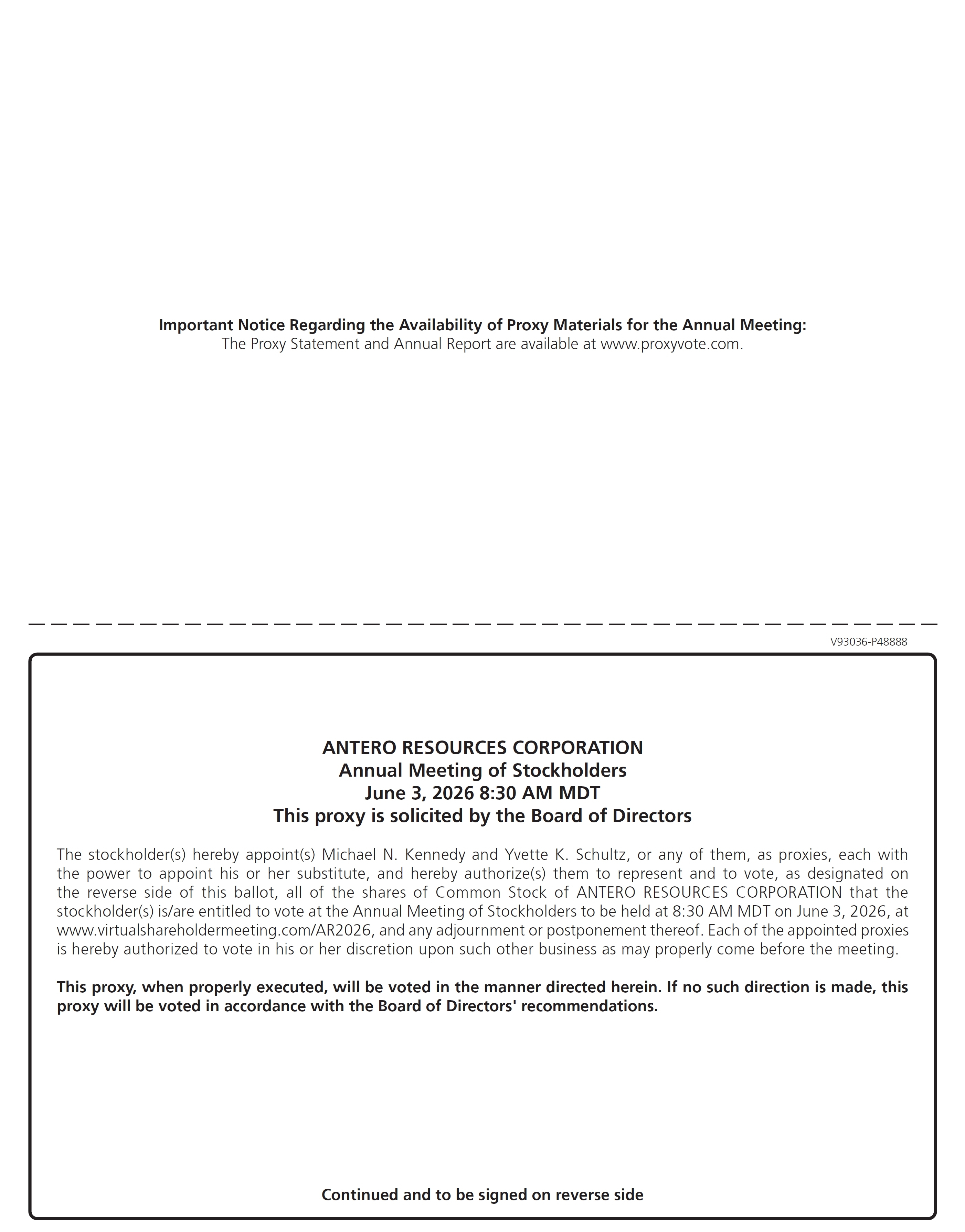 Important Notice Regarding the Availability of Proxy Materials for the Annual Meeting: The Proxy Statement and Annual Report are available at www.proxyvote.com. ANTERO RESOURCES CORPORATION Annual Meeting of Stockholders June 3, 2026 8:30 AM MDT This proxy is solicited by the Board of Directors The stockholder(s) hereby appoint(s) Michael N. Kennedy and Yvette K. Schultz, or any of them, as proxies, each with the power to appoint his or her substitute, and hereby authorize(s) them to represent and to vote, as designated on the reverse side of this ballot, all of the shares of Common Stock of ANTERO RESOURCES CORPORATION that the stockholder(s) is/are entitled to vote at the Annual Meeting of Stockholders to be held at 8:30 AM MDT on June 3, 2026, at www.virtualshareholdermeeting.com/AR2026, and any adjournment or postponement thereof. Each of the appointed proxies is hereby authorized to vote in his or her discretion upon such other business as may properly come before the meeting. This proxy, when properly executed, will be voted in the manner directed herein. If no such direction is made, this proxy will be voted in accordance with the Board of Directors’ recommendations. Continued and to be signed on reverse side