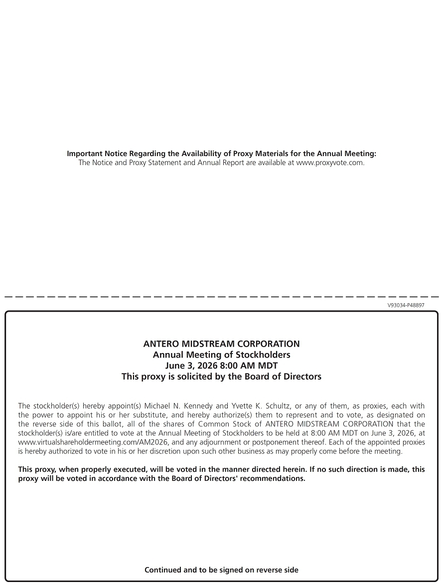 Important Notice Regarding the Availability of Proxy Materials for the Annual Meeting:The Notice and Proxy Statement and Annual Report are available at www.proxyvote.com. V93034-P48897 ANTERO MIDSTREAM CORPORATION Annual Meeting of Stockholders June 3, 2026 8:00 AM MDT This proxy is solicited by the Board of Directors The stockholder(s) hereby appoint(s) Michael N. Kennedy and Yvette K. Schultz, or any of them, as proxies, each with the power to appoint his or her substitute, and hereby authorize(s) them to represent and to vote, as designated on the reverse side of this ballot, all of the shares of Common Stock of ANTERO MIDSTREAM CORPORATION that the stockholder(s) is/are entitled to vote at the Annual Meeting of Stockholders to be held at 8:00 AM MDT on June 3, 2026, at www.virtualshareholdermeeting.com/AM2026, and any adjournment or postponement thereof. Each of the appointed proxies is hereby authorized to vote in his or her discretion upon such other business as may properly come before the meeting. This proxy, when properly executed, will be voted in the manner directed herein. If no such direction is made, this proxy will be voted in accordance with the Board of Directors' recommendations. Continued and to be signed on reverse side