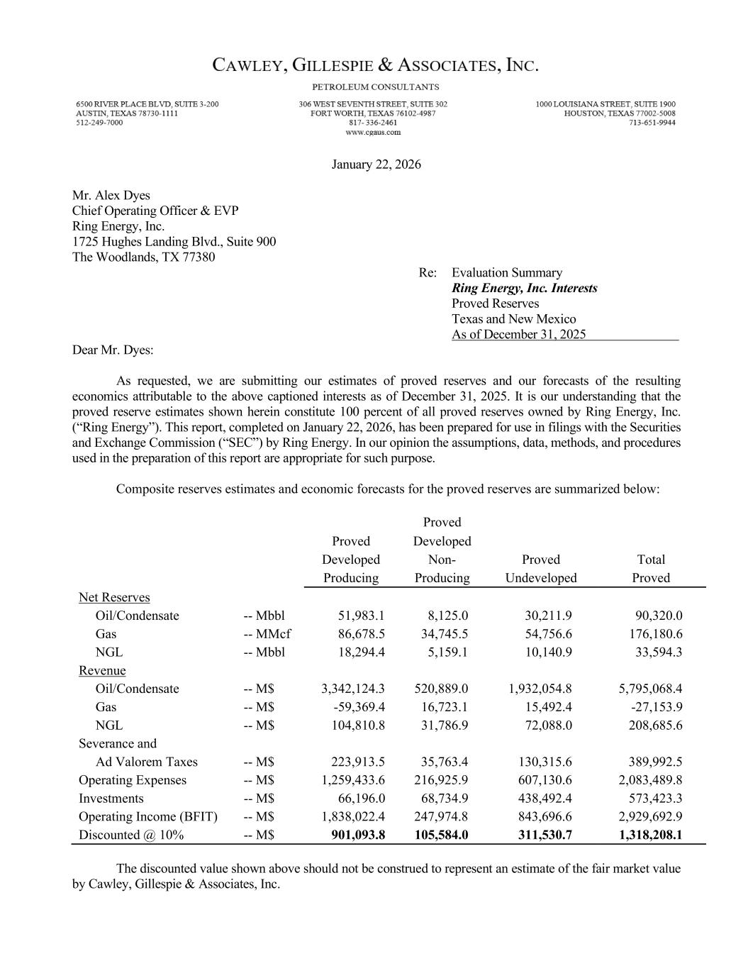 January 22, 2026 Mr. Alex Dyes Chief Operating Officer & EVP Ring Energy, Inc. 1725 Hughes Landing Blvd., Suite 900 The Woodlands, TX 77380 Re: Evaluation Summary Ring Energy, Inc. Interests Proved Reserves Texas and New Mexico As of December 31, 2025 Dear Mr. Dyes: As requested, we are submitting our estimates of proved reserves and our forecasts of the resulting economics attributable to the above captioned interests as of December 31, 2025. It is our understanding that the proved reserve estimates shown herein constitute 100 percent of all proved reserves owned by Ring Energy, Inc. (“Ring Energy”). This report, completed on January 22, 2026, has been prepared for use in filings with the Securities and Exchange Commission (“SEC”) by Ring Energy. In our opinion the assumptions, data, methods, and procedures used in the preparation of this report are appropriate for such purpose. Composite reserves estimates and economic forecasts for the proved reserves are summarized below: Proved Proved Developed Developed Non- Proved Total Producing Producing Undeveloped Proved Net Reserves Oil/Condensate -- Mbbl 51,983.1 8,125.0 30,211.9 90,320.0 Gas -- MMcf 86,678.5 34,745.5 54,756.6 176,180.6 NGL -- Mbbl 18,294.4 5,159.1 10,140.9 33,594.3 Revenue Oil/Condensate -- M$ 3,342,124.3 520,889.0 1,932,054.8 5,795,068.4 Gas -- M$ -59,369.4 16,723.1 15,492.4 -27,153.9 NGL -- M$ 104,810.8 31,786.9 72,088.0 208,685.6 Severance and Ad Valorem Taxes -- M$ 223,913.5 35,763.4 130,315.6 389,992.5 Operating Expenses -- M$ 1,259,433.6 216,925.9 607,130.6 2,083,489.8 Investments -- M$ 66,196.0 68,734.9 438,492.4 573,423.3 Operating Income (BFIT) -- M$ 1,838,022.4 247,974.8 843,696.6 2,929,692.9 Discounted @ 10% -- M$ 901,093.8 105,584.0 311,530.7 1,318,208.1 The discounted value shown above should not be construed to represent an estimate of the fair market value by Cawley, Gillespie & Associates, Inc.