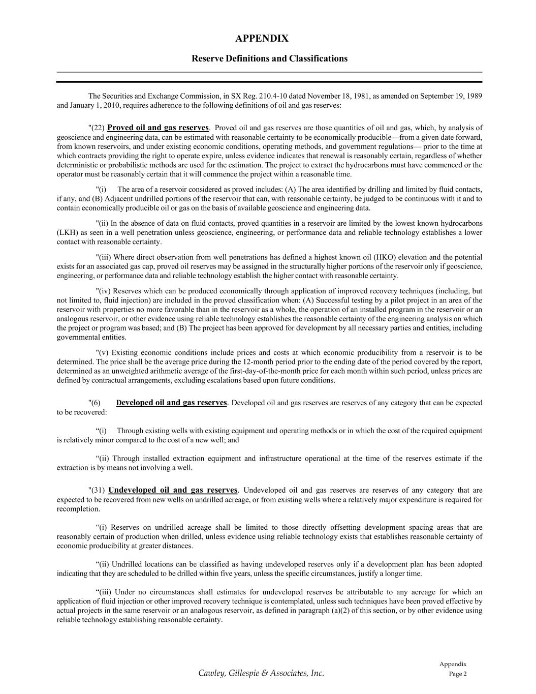 APPENDIX Appendix Page 2 Cawley, Gillespie & Associates, Inc. Reserve Definitions and Classifications The Securities and Exchange Commission, in SX Reg. 210.4-10 dated November 18, 1981, as amended on September 19, 1989 and January 1, 2010, requires adherence to the following definitions of oil and gas reserves: "(22) Proved oil and gas reserves. Proved oil and gas reserves are those quantities of oil and gas, which, by analysis of geoscience and engineering data, can be estimated with reasonable certainty to be economically producible—from a given date forward, from known reservoirs, and under existing economic conditions, operating methods, and government regulations— prior to the time at which contracts providing the right to operate expire, unless evidence indicates that renewal is reasonably certain, regardless of whether deterministic or probabilistic methods are used for the estimation. The project to extract the hydrocarbons must have commenced or the operator must be reasonably certain that it will commence the project within a reasonable time. "(i) The area of a reservoir considered as proved includes: (A) The area identified by drilling and limited by fluid contacts, if any, and (B) Adjacent undrilled portions of the reservoir that can, with reasonable certainty, be judged to be continuous with it and to contain economically producible oil or gas on the basis of available geoscience and engineering data. "(ii) In the absence of data on fluid contacts, proved quantities in a reservoir are limited by the lowest known hydrocarbons (LKH) as seen in a well penetration unless geoscience, engineering, or performance data and reliable technology establishes a lower contact with reasonable certainty. "(iii) Where direct observation from well penetrations has defined a highest known oil (HKO) elevation and the potential exists for an associated gas cap, proved oil reserves may be assigned in the structurally higher portions of the reservoir only if geoscience, engineering, or performance data and reliable technology establish the higher contact with reasonable certainty. "(iv) Reserves which can be produced economically through application of improved recovery techniques (including, but not limited to, fluid injection) are included in the proved classification when: (A) Successful testing by a pilot project in an area of the reservoir with properties no more favorable than in the reservoir as a whole, the operation of an installed program in the reservoir or an analogous reservoir, or other evidence using reliable technology establishes the reasonable certainty of the engineering analysis on which the project or program was based; and (B) The project has been approved for development by all necessary parties and entities, including governmental entities. "(v) Existing economic conditions include prices and costs at which economic producibility from a reservoir is to be determined. The price shall be the average price during the 12-month period prior to the ending date of the period covered by the report, determined as an unweighted arithmetic average of the first-day-of-the-month price for each month within such period, unless prices are defined by contractual arrangements, excluding escalations based upon future conditions. "(6) Developed oil and gas reserves. Developed oil and gas reserves are reserves of any category that can be expected to be recovered: “(i) Through existing wells with existing equipment and operating methods or in which the cost of the required equipment is relatively minor compared to the cost of a new well; and “(ii) Through installed extraction equipment and infrastructure operational at the time of the reserves estimate if the extraction is by means not involving a well. "(31) Undeveloped oil and gas reserves. Undeveloped oil and gas reserves are reserves of any category that are expected to be recovered from new wells on undrilled acreage, or from existing wells where a relatively major expenditure is required for recompletion. “(i) Reserves on undrilled acreage shall be limited to those directly offsetting development spacing areas that are reasonably certain of production when drilled, unless evidence using reliable technology exists that establishes reasonable certainty of economic producibility at greater distances. “(ii) Undrilled locations can be classified as having undeveloped reserves only if a development plan has been adopted indicating that they are scheduled to be drilled within five years, unless the specific circumstances, justify a longer time. “(iii) Under no circumstances shall estimates for undeveloped reserves be attributable to any acreage for which an application of fluid injection or other improved recovery technique is contemplated, unless such techniques have been proved effective by actual projects in the same reservoir or an analogous reservoir, as defined in paragraph (a)(2) of this section, or by other evidence using reliable technology establishing reasonable certainty.