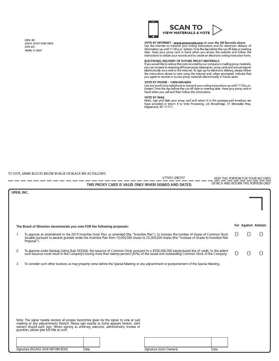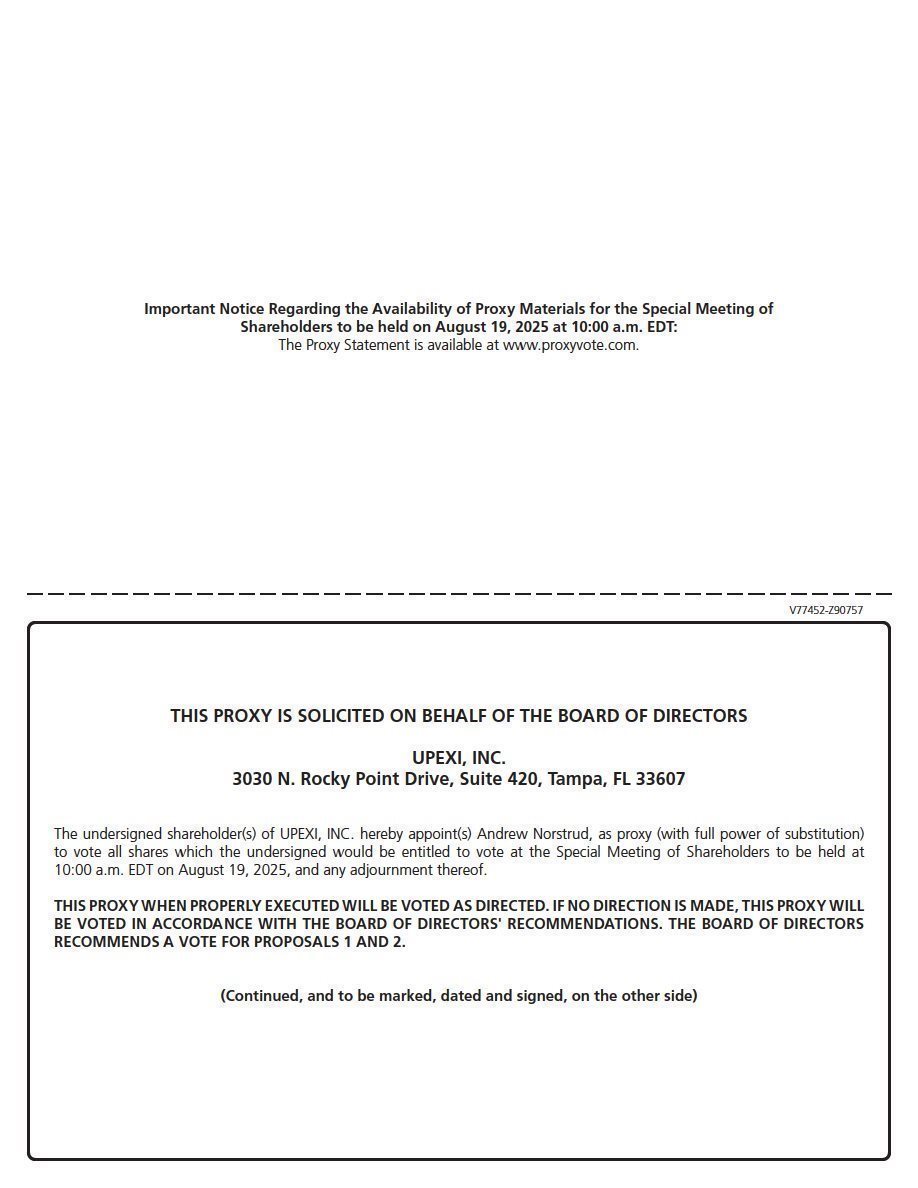 We are pleased to announce that the Special Meeting of shareholders (the “Special Meeting”) of Upexi, Inc. (“we,” “our,” “us,” “Company,” or “Upexi”) will be held at 10:00 a.m. EDT on Tuesday, August 19, 2025. You are invited to participate in the Special Meeting.