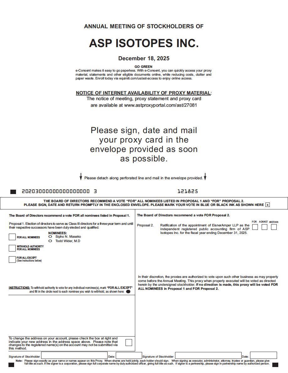 The Annual Meeting of Stockholders (the “Annual Meeting”) of ASP Isotopes Inc. (the “Company”) will be held on Thursday, December 18, 2025, at 10:00 a.m., Eastern time. The Annual Meeting will be held in a virtual format via live webcast over the Internet. You will be able to join the Annual Meeting and vote and submit your questions online during the Annual Meeting by visiting https://meetings.lumiconnect.com/200-529-383-259. We have designed the virtual Annual Meeting to ensure that stockholders are afforded the same opportunity to participate as they would have at an in-person meeting, including the right to vote and ask questions through the virtual meeting platform. Reference to “in person” attendance or voting in our proxy materials refers, therefore, to attending or voting at the Annual Meeting virtually.