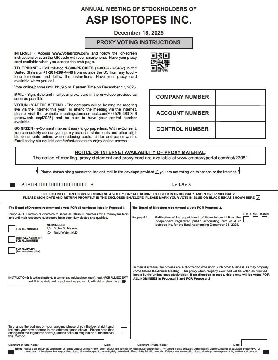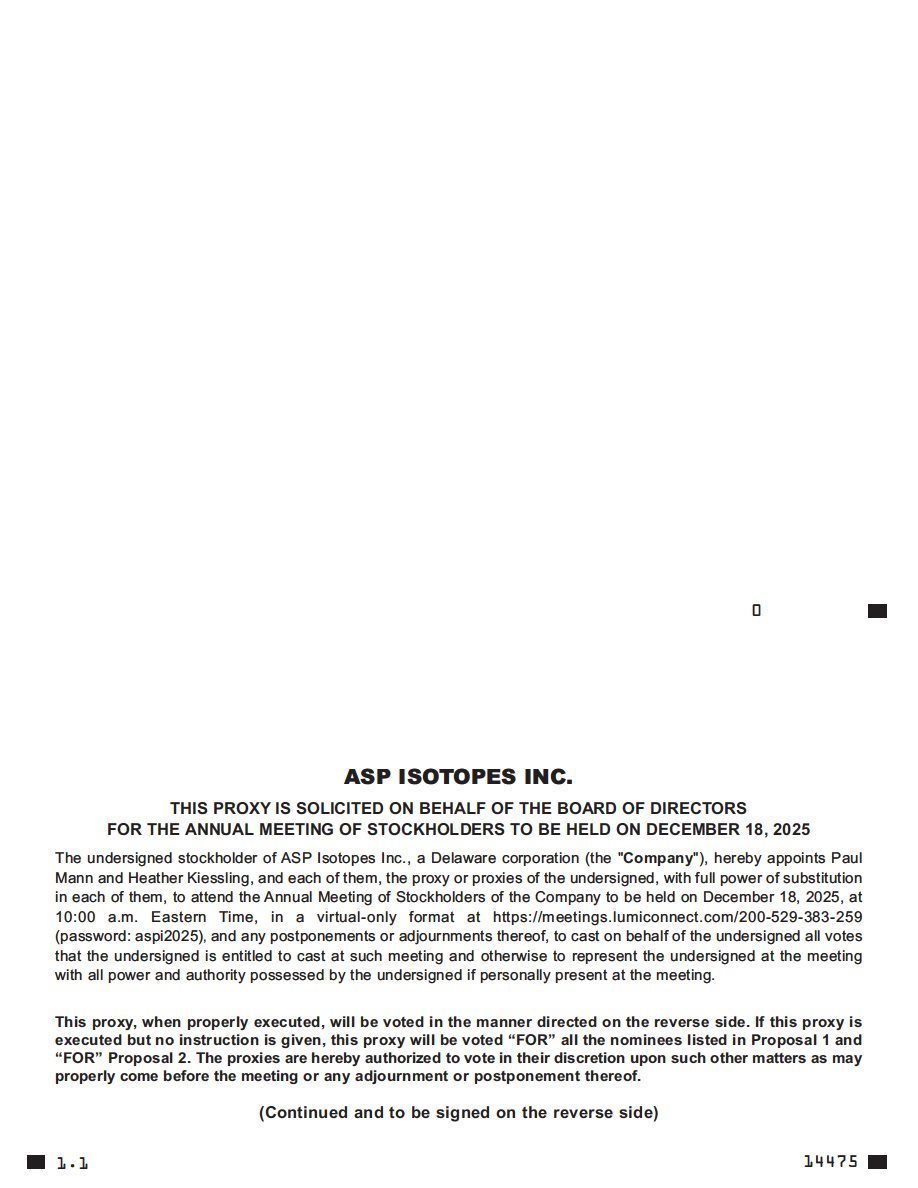The board of directors (the “Board”) of ASP Isotopes Inc. (the “Company” or “ASPI”) is soliciting proxies for use at the 2025 Annual Meeting of Stockholders (the “Annual Meeting”) to be held on Thursday, December 18, 2025, at 10:00 a.m., Eastern time, and any postponements or adjournments thereof. The Annual Meeting will be held in a virtual format only, via live webcast over the Internet. You will be able to join the Annual Meeting and vote and submit your questions online during the Annual Meeting by visiting https://meetings.lumiconnect.com/200-529-383-259. We have designed the virtual Annual Meeting to ensure that stockholders are afforded the same opportunity to participate as they would have at an in-person meeting, including the right to vote and ask questions through the virtual meeting platform. Reference to “in person” attendance or voting in our proxy materials refers, therefore, to attending or voting at the Annual Meeting virtually.
