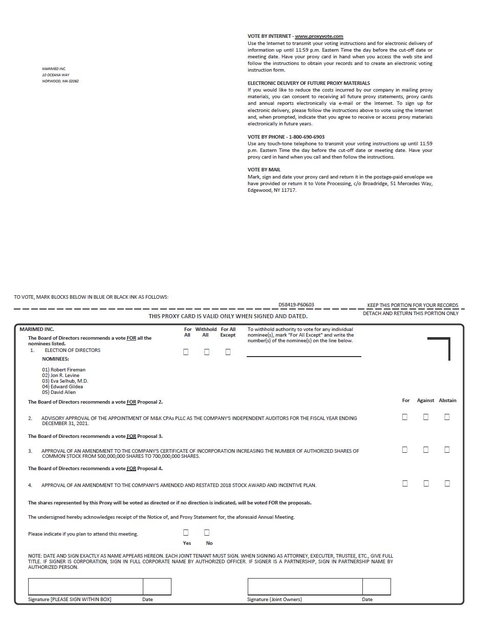 Proxies in the form enclosed with this Proxy Statement are solicited by the Board of Directors (the “Board”) of MariMed Inc. (the “Company,” “we,” “us,” “our,” or any derivative thereof) to be used at the Annual Meeting of Stockholders (the “Annual Meeting”) to be held at the Hilton Boston/Dedham Hotel located at 25 Allied Drive, Dedham, Massachusetts 02026, on Thursday, September 23, 2021 at 10:00 a.m. Eastern Daylight Time for the purposes set forth in the Notice of Meeting and this Proxy Statement. The Company’s principal executive offices are located at 10 Oceana Way, Norwood, Massachusetts 02062. The approximate date on which this Proxy Statement, the accompanying Proxy and the Company’s Annual Report for the year ended December 31, 2020 (“2020 Annual Report”) will be mailed to stockholders is August 20, 2021.