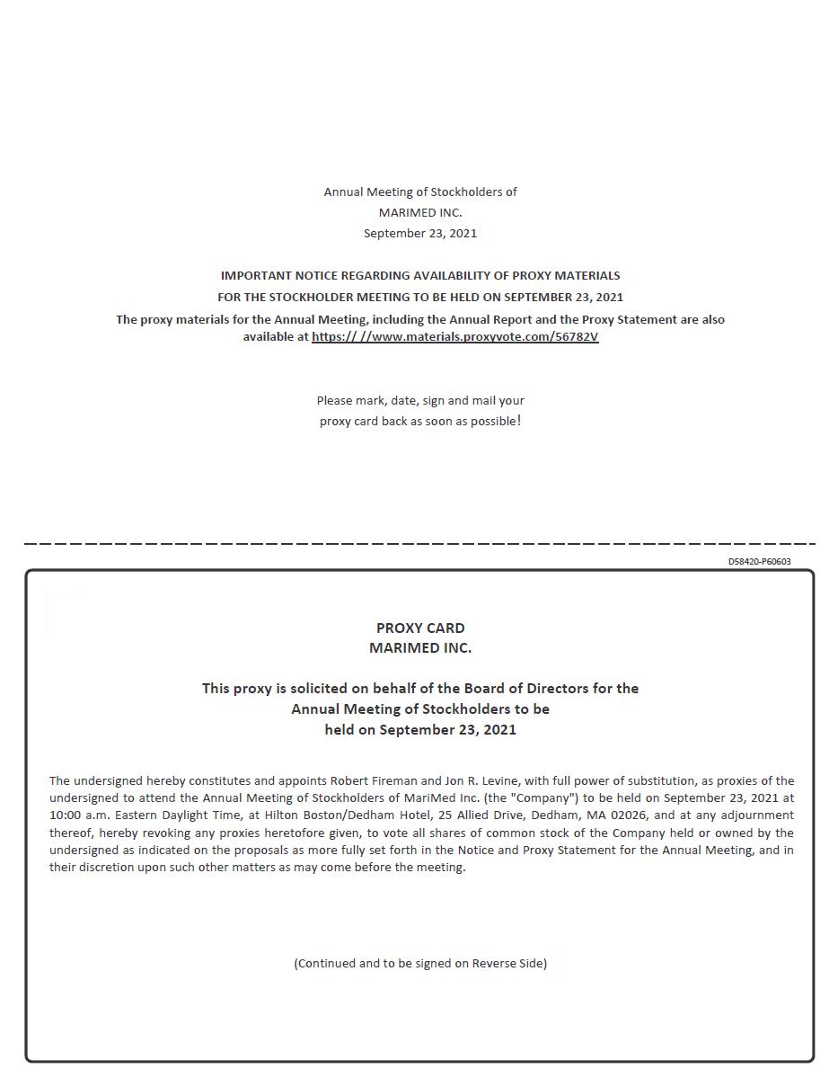 You are invited to attend the 2021 Annual Meeting of Stockholders of MariMed Inc. at 10:00 a.m. Eastern Daylight Time on September 23, 2021 at the Hilton Boston/Dedham Hotel located at 25 Allied Drive, Dedham, Massachusetts 02026.
