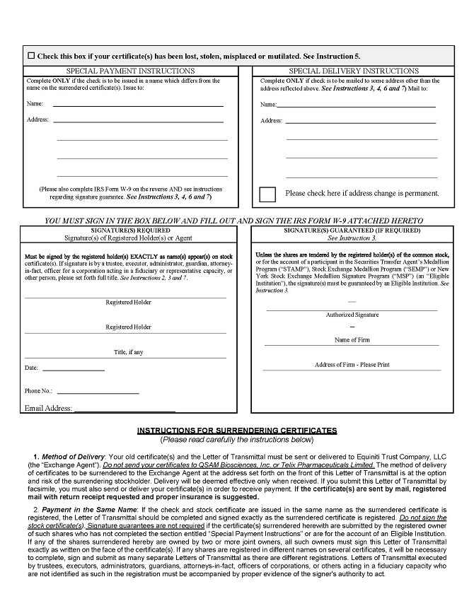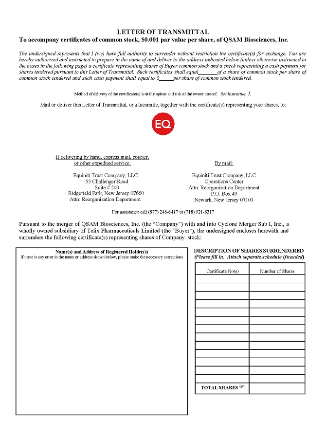 This Letter of Transmittal is being delivered to you in connection with the acquisition of QSAM Biosciences, Inc. (the “Company”) by Telix Pharmaceuticals Limited (the “Buyer”), pursuant to the Agreement and Plan of Merger dated as of [●], 2024 (the “Merger Agreement”), by and among the Buyer, the Company, Cyclone Merger Sub I, Inc., Cyclone Merger Sub II, Inc. and David H. Clarke, solely in his capacity as Company Stockholder Representative (the “Company Stockholder Representative”). Capitalized terms not defined herein are defined in the Merger Agreement.
