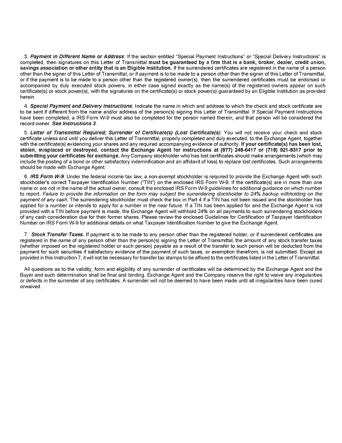 As a result of the First Merger and the Second Merger, (a) the Final Surviving Corporation has become a wholly owned subsidiary of the Buyer and (b) the outstanding shares of Company Capital Stock (the “Securities”) (other than any Cancelled Shares or Dissenting Shares) have been cancelled and converted into the right to receive the consideration specified in the Merger Agreement (the “Consideration”). To receive payment of the Consideration represented by your Securities, you (the “Undersigned”) must complete and sign this Letter of Transmittal, including the applicable exhibits, and deliver this Letter of Transmittal to Equiniti Trust Company, LLC (the “Exchange Agent”).
