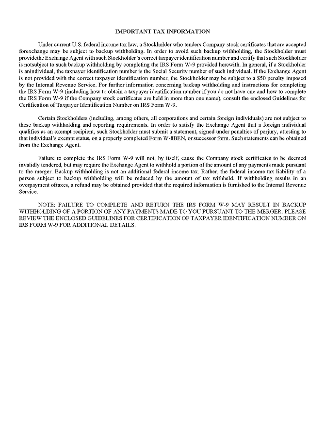 In accordance with the Merger Agreement, except as otherwise provided below, the certificates representing your former Securities listed in the Exchange Agent’s form of Letter of Transmittal attached hereto as Attachment 1 are hereby surrendered to be exchanged for the Consideration on the terms set forth in the Merger Agreement and this Letter of Transmittal. By signing and submitting this Letter of Transmittal, you also hereby represent, warrant, covenant and agree as follows: