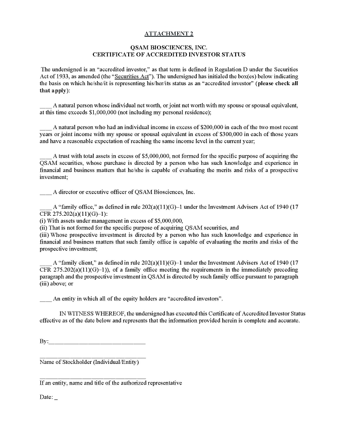 As you may be aware, QSAM Biosciences, Inc. (the “Company”) recently entered into an Agreement and Plan of Merger (the “Merger Agreement”) dated [●], 2024 by and among the Company, Telix Pharmaceuticals Limited ACN 616 620 369, a public limited company registered under the Laws of the Commonwealth of Australia (“Buyer”), Cyclone Merger Sub I, Inc., a Delaware corporation and a direct, wholly owned subsidiary of Buyer (“Merger Sub I”), Cyclone Merger Sub II, Inc., a Delaware corporation and a direct, wholly owned subsidiary of Buyer (“Merger Sub II”), and David H. Clarke, pursuant to which Merger Sub I will merge with and into the Company, Merger Sub I will cease to exist, and the Company will survive as a direct, wholly owned subsidiary of Buyer, and as part of the same overall transaction, the Company will merge with and into Merger Sub II, the Company will cease to exist, and Merger Sub II will survive as a direct, wholly owned subsidiary of Buyer (the “Merger”).