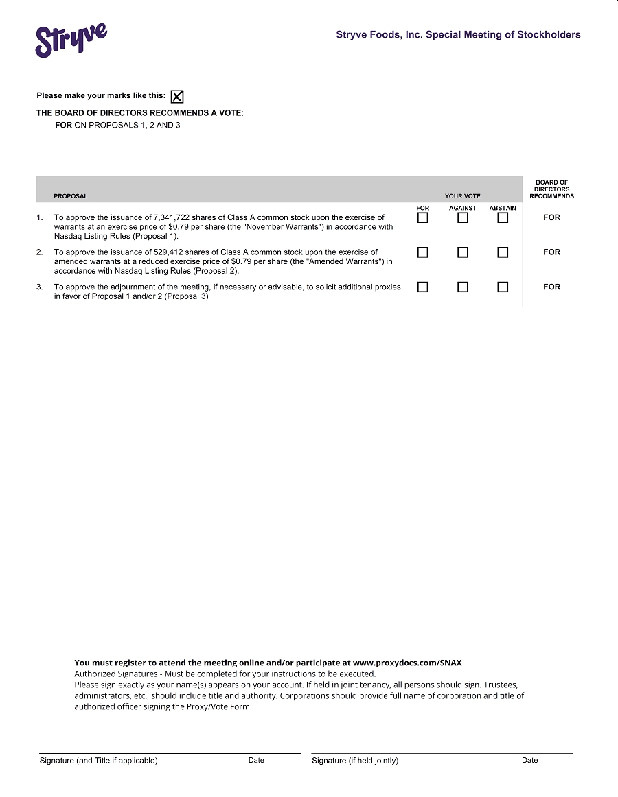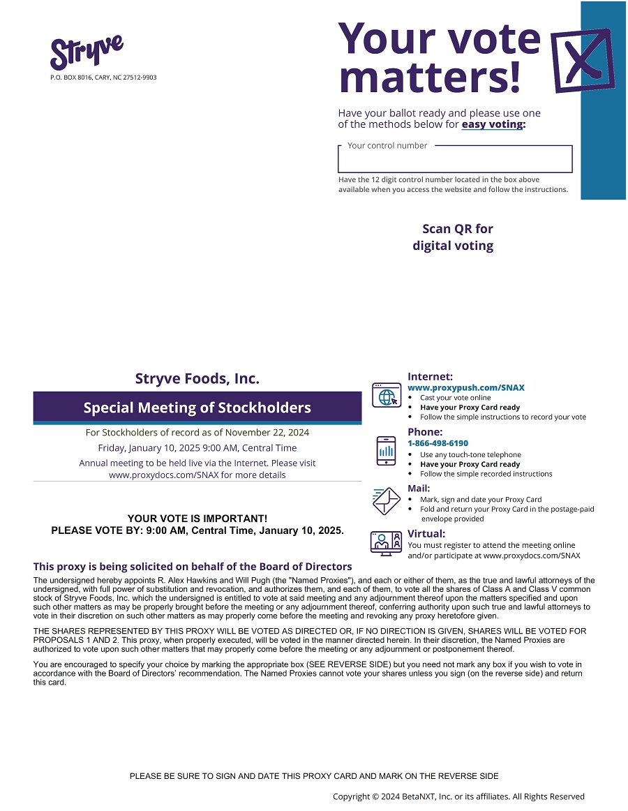 PLEASE TAKE NOTICE that a Special Meeting of Stockholders of Stryve Foods, Inc. (the “Special Meeting”) will be held virtually on Friday, January 10, 2025 at 9:00 AM, Central Time. You will be able to participate in the Special Meeting online, vote your shares electronically and submit your questions prior to and during the meeting. You must register to attend the Special Meeting online and/or participate at www.proxydocs.com/SNAX. There is no physical location for the Special Meeting. At the meeting, the holders of outstanding common stock will act on the following matters: