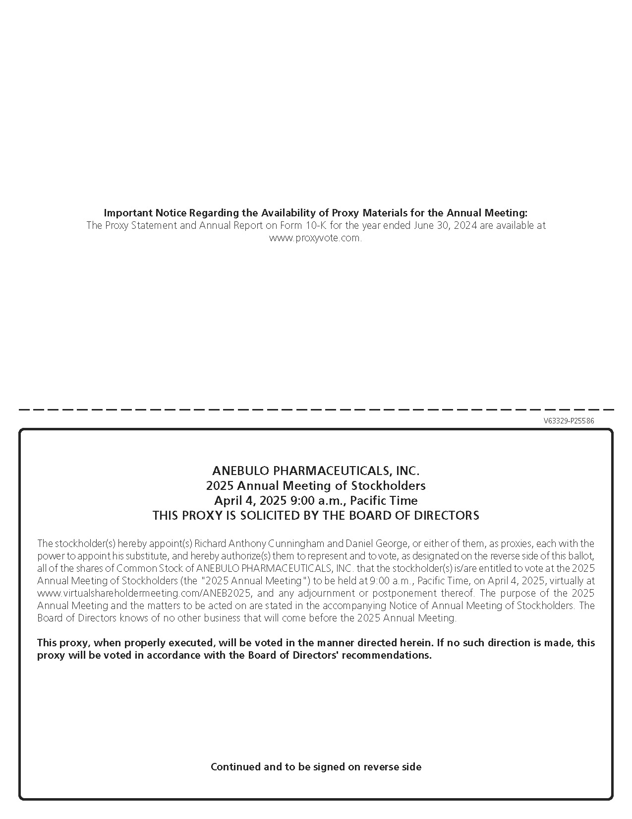 The Board of Directors of Anebulo Pharmaceuticals, Inc. is soliciting your proxy to be used at the Annual Meeting, including at any adjournments or postponements of the Annual Meeting. You are invited to attend the Annual Meeting online to vote on the proposals described in this proxy statement. However, you do not need to attend the Annual Meeting to vote your shares. Instead, you may simply complete, sign and return the enclosed proxy card, or follow the instructions below to submit your proxy through the internet.