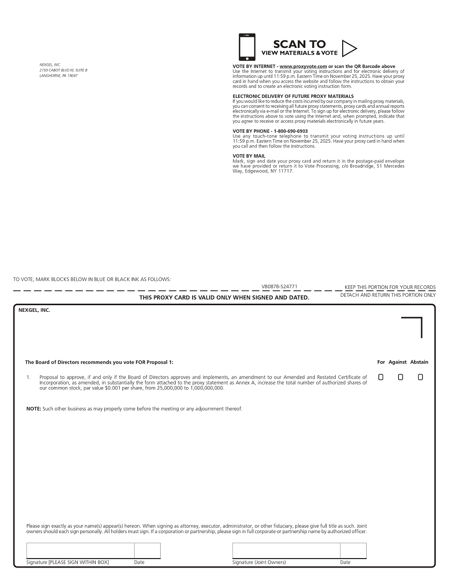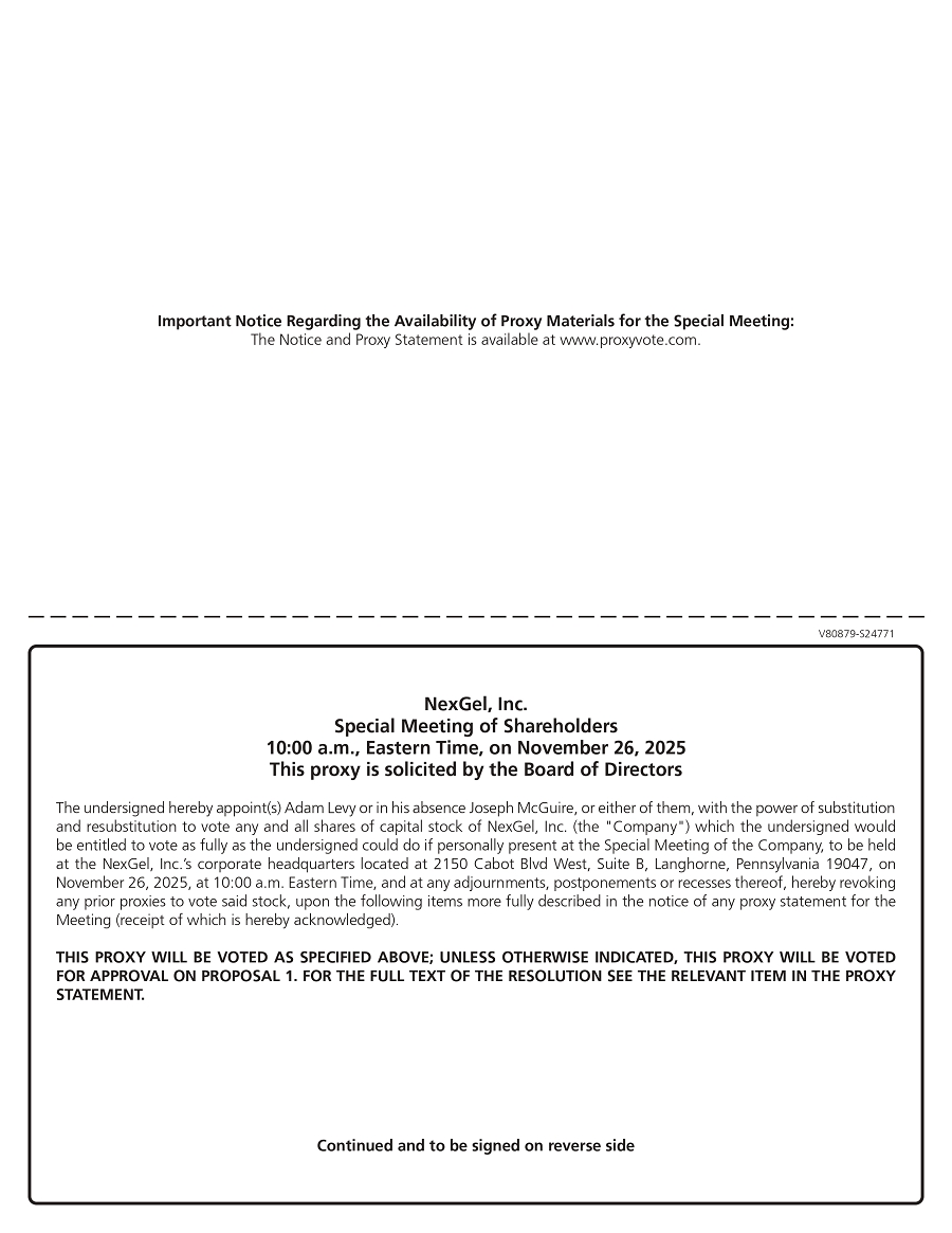 You are cordially invited to attend the Special Meeting of Stockholders (the “Special Meeting”) of NexGel, Inc., a Delaware corporation (the “Company,” “NexGel,” “we,” “us” or “our”), to be held at 10:00 a.m., Eastern Time, on November 26, 2025, at our corporate headquarters located at 2150 Cabot Blvd West, Suite B, Langhorne, Pennsylvania 19047.