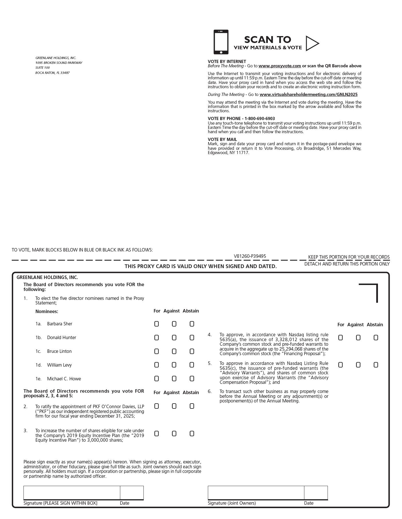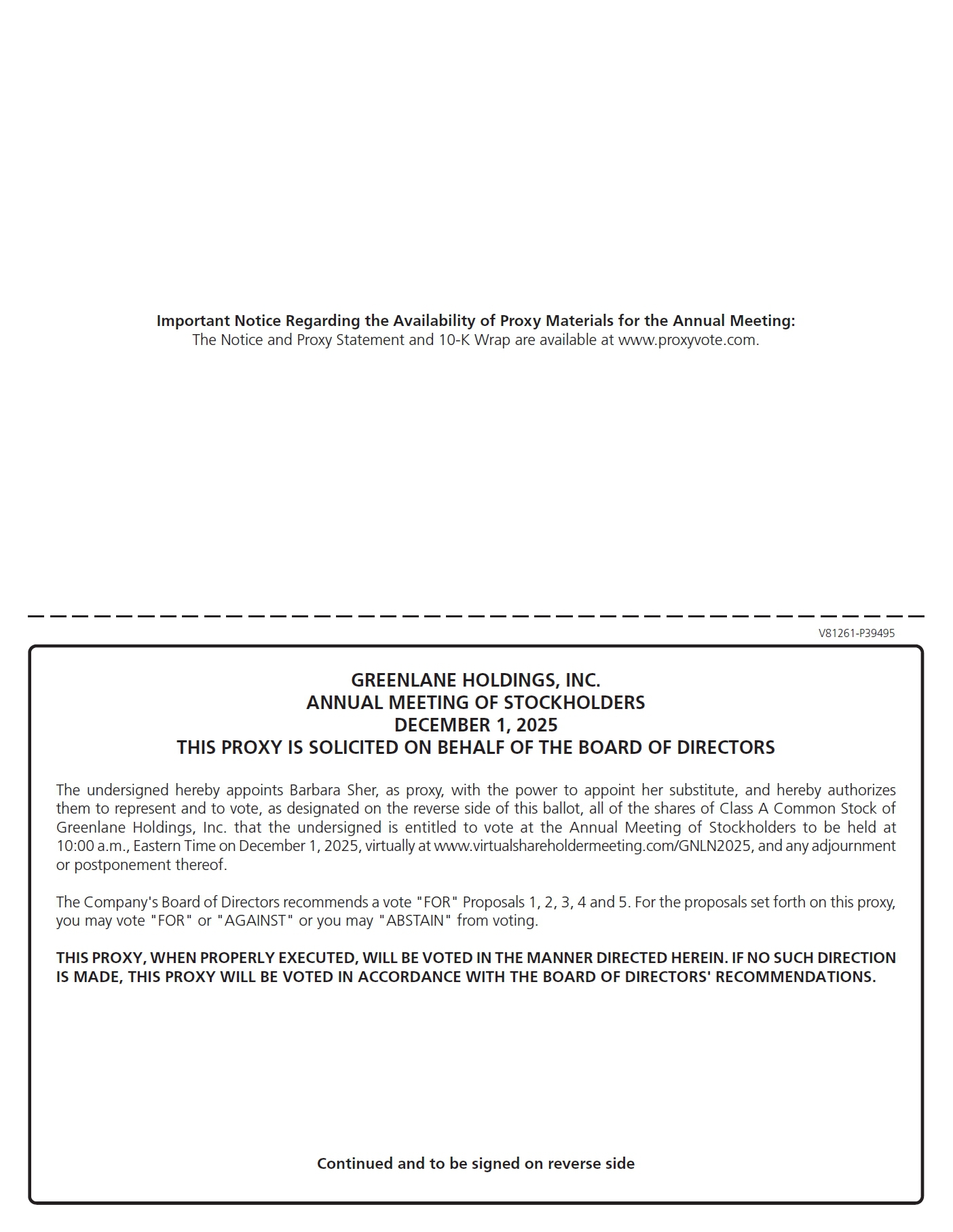 You are cordially invited to attend the 2025 Annual Meeting of Stockholders (the “Annual Meeting”) of Greenlane Holdings, Inc., which will be held in a completely virtual format on December 1, 2025, at 10:00 a.m. Eastern Time. Please see page 3 of the Proxy Statement for instructions regarding access to the virtual Annual Meeting.