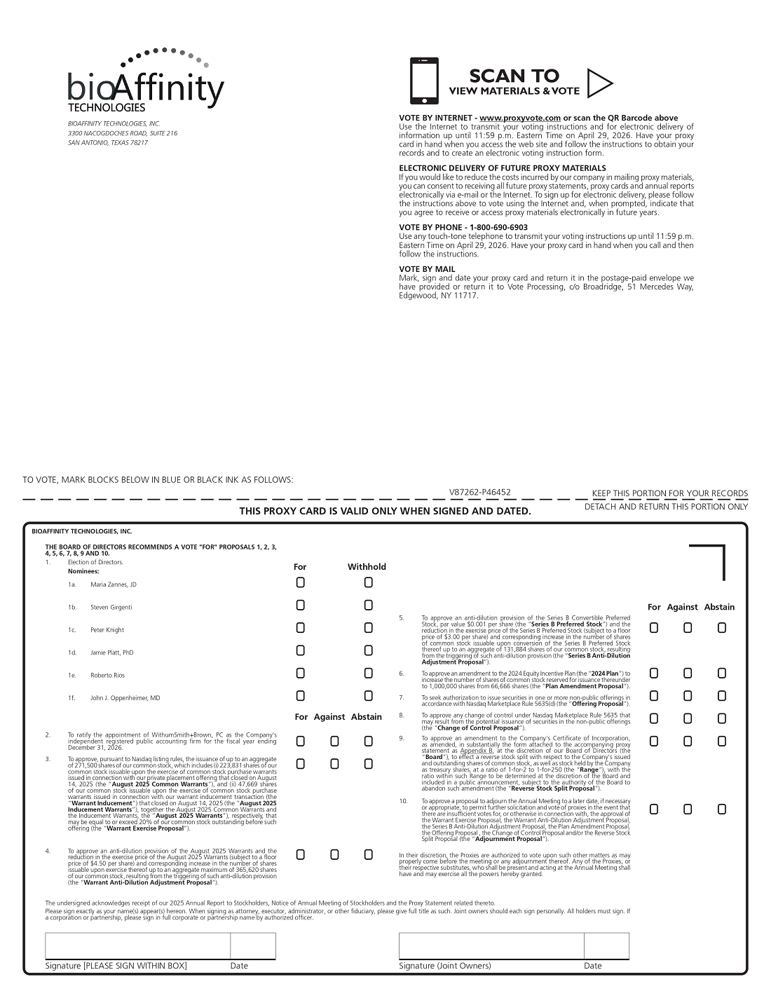I am pleased to invite you to attend the Annual Meeting of Stockholders (the “Annual Meeting”) of bioAffinity Technologies, Inc. (the “Company” or “bioAffinity Technologies”) on Thursday, April 30, 2026, at 8:00 a.m. Central Time. The Annual Meeting will be held in person at the Company’s principal office at 3300 Nacogdoches Road, Suite 216, San Antonio, Texas 78217.