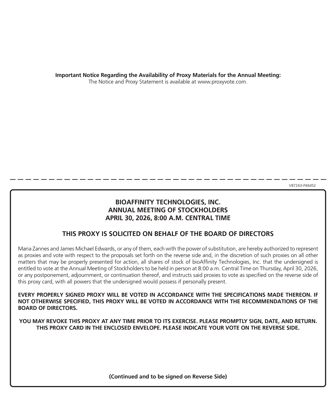The Board of bioAffinity Technologies, Inc. is soliciting your proxy to be used at the Annual Meeting.