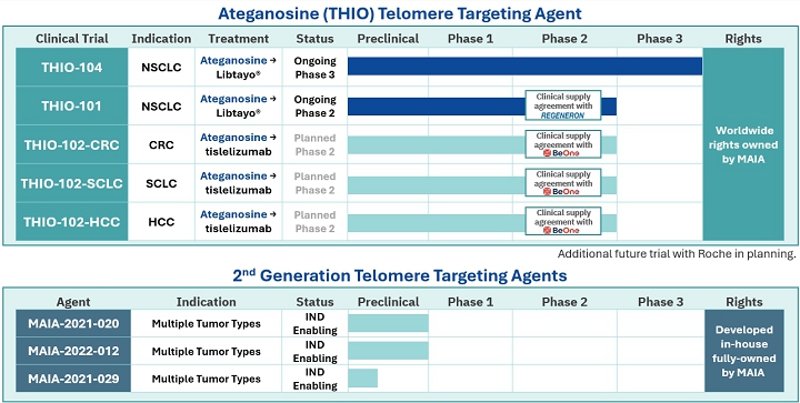 MAIA Biotechnology, Inc. (MAIA, the Company, we, or us) is a clinical-stage biopharmaceutical company developing targeted immunotherapies for cancer. Ateganosine (THIO, 6-thio-dG or 6-thio-2 ‘-deoxyguanosine), our lead asset, is an investigational dual mechanism of action drug candidate incorporating telomere targeting and immunogenicity. In July 2022, the first patient was administered with ateganosine in our Phase 2 human trial (THIO-101) in Australia. In December 2022, regulatory authorities in three European countries, Hungary, Poland, and Bulgaria, approved the implementation of THIO-101, Phase 2 clinical trial evaluating ateganosine in patients with Non-Small Cell Lung Cancer (NSCLC). In the trial, patients with advanced NSCLC are treated first with ateganosine followed a few days later by the immune checkpoint inhibitor Libtayo® (cemiplimab), manufactured and commercialized by Regeneron. Cemiplimab is a fully human monoclonal antibody targeting the immune checkpoint receptor PD-1 on T-cells. Cemiplimab has been approved in the United States and the rest of the world for multiple cancer indications, including NSCLC. In February 2021, we signed a clinical supply agreement with Regeneron to receive cemiplimab at no cost, which represents a significant cost-savings for the study. In return, we have granted Regeneron exclusive development rights in combination with PD-1 inhibitors for NSCLC for the study period. In July 2025, we initiated an expansion of the THIO-101 trial focused on third-line NSCLC patients who are resistant to checkpoint inhibitors and chemotherapy. The expansion will enroll up to 48 patients with two arms: Arm 1, continuing the evaluation of ateganosine sequenced with Libtayo® (cemiplimab); and Arm 2, evaluating ateganosine as a monotherapy, to further gain experience of ateganosine in the contribution of components. Based on the clinical data generated by our THIO-101 trial, we plan to seek filing for an accelerated approval of ateganosine in the United States for the treatment of patients with advanced NSCLC in 2026, but even if granted, accelerated approval status does not guarantee an accelerated review or marketing approval by the Food and Drug Administration (FDA).We initiated a Phase 3 pivotal trial in 2025, named THIO-104, to evaluate the efficacy of ateganosine administered in sequence with a checkpoint inhibitor (CPI) in third-line NSCLC patients who are resistant to checkpoint inhibitors and chemotherapy. The multicenter, open-label, pivotal Phase 3 trial is designed to provide a direct comparison to chemotherapy in a 1:1 randomization of up to 300 patients. In addition, the originally planned Phase 2 clinical trial in multiple tumor indications (THIO-102) is now divided into different trials for one tumor indication each: hepatocellular carcinoma (HCC), colorectal cancer (CRC) and small cell lung cancer (SCLC). Phase 2 clinical trials in HCC, CRC and SCLC are planned to be initiated in 2026, evaluating treatment with ateganosine administered in sequence with BeOne Medicines’s immune checkpoint inhibitor, tislelizumab. Clinical trials with other solid tumors (ST), such as breast, prostate, gastric, pancreatic and ovarian, may still be considered for potential future trials.