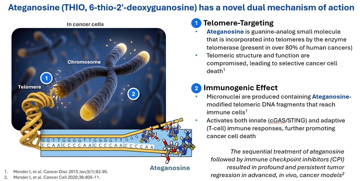 Ateganosine is a telomere-targeting agent currently in clinical development to evaluate its activity in NSCLC. Telomeres, along with the enzyme telomerase, play a fundamental role in the survival of cancer cells and their resistance to current therapies. Ateganosine is being developed as a second- or later line of treatment for NSCLC for patients that have progressed beyond the standard-of-care regimen of existing checkpoint inhibitors.