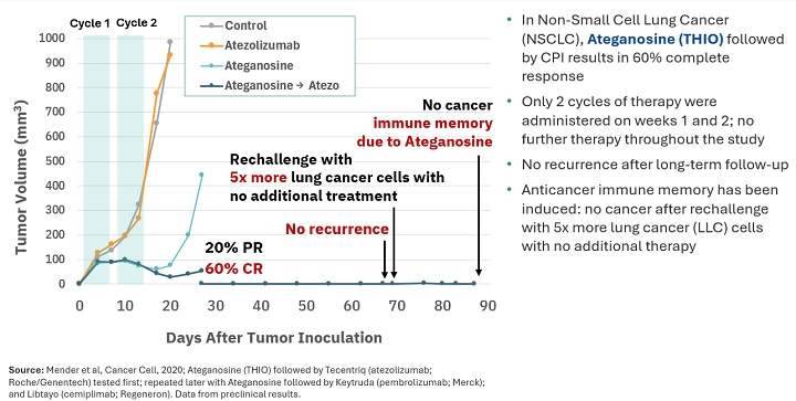 On April 20, 2023, we announced preliminary survival data from Part A of THIO-101. The first two patients enrolled in Part A of the study continued to be alive, approximately 10 and 9 months respectively, from treatment initiation. Both patients have advanced Stage IV metastatic disease and are heavily pretreated, receiving third and fourth line of therapy respectively after previously failing treatment with an immune checkpoint inhibitor. They continue to be progression free following their last dose of ateganosine, 7 and 6 months respectively, with no new treatment. The current treatment options in patients with advanced relapsed or refractory NSCLC who failed two or more therapy regimens are limited and show minimal benefit. Furthermore, discontinuation of treatment is rapidly followed by physical decline and death, therefore seeing patients with such survival and no disease progression in this clinical setting, is noteworthy. In real-world clinical practice, observed survival in such heavily pretreated patients is 3-4 months.