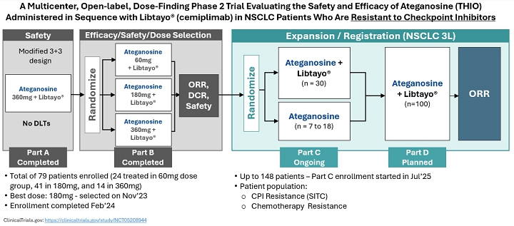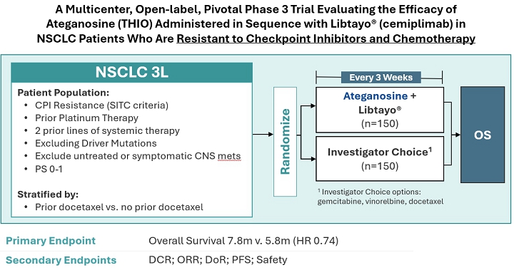 On December 19, 2023, we announced dose selection for THIO-101, a Phase 2 clinical trial evaluating its lead asset, ateganosine, in sequential combination with Regeneron’s anti-PD-1 cemiplimab (Libtayo®) in patients with advanced NSCLC. During the dose-finding stage of THIO-101, patients were administered either 60mg, 180mg, or 360mg of ateganosine per cycle, followed by 350mg of cemiplimab (Libtayo®). The selected dose, 180mg/cycle, presented better safety profile and outperformed the other doses in the key measures of efficacy for NSCLC trials. Subsequently, all future trial participants will be treated with ateganosine 180mg/cycle.