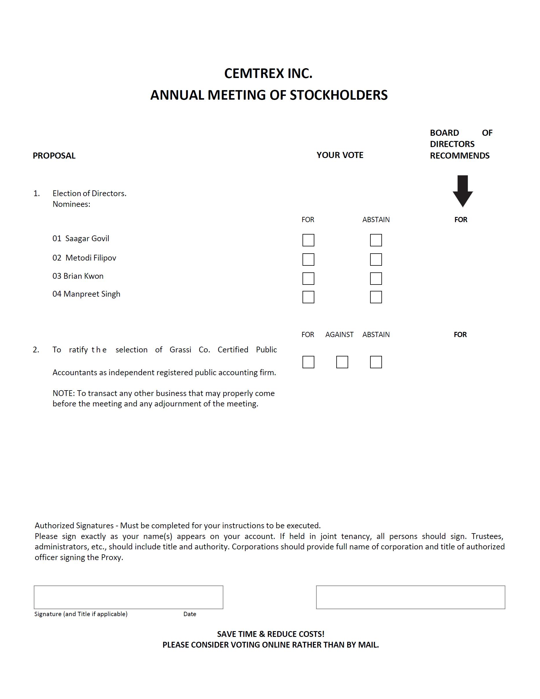“FOR” the election of each of the four nominees, Saagar Govil, Metodi Filipov, Brian Kwon, and Manpreet Singh proposed by the Board of Directors to serve as directors, each for a term of one year or until Cemtrex’s 2026 Annual Meeting of Stockholders (Proposal 1);