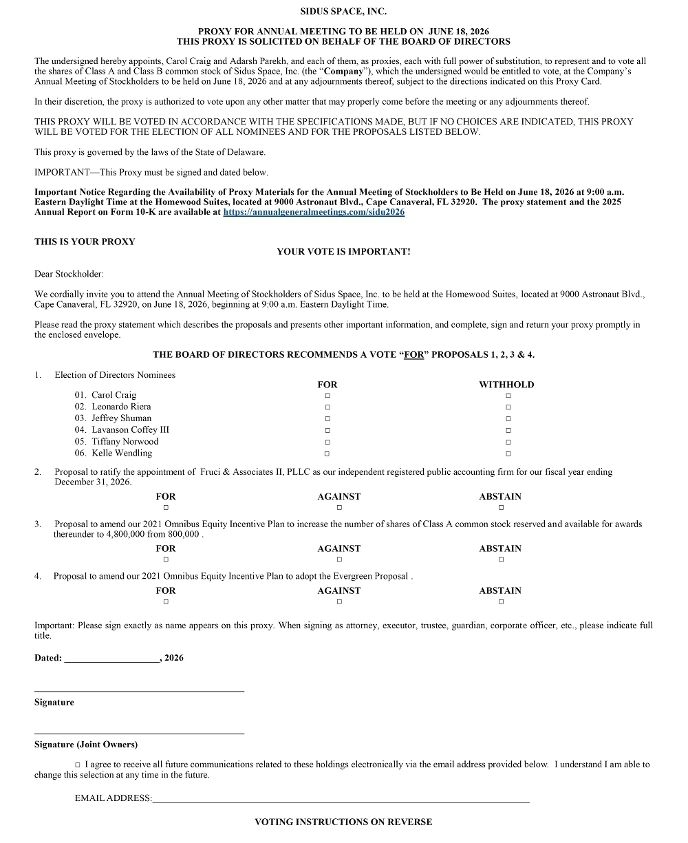 We are pleased to invite you to attend the annual meeting of stockholders (the “Annual Meeting”) of Sidus Space, Inc. (“Sidus” or the “Company”), which will be held on June 18, 2026 at 9:00 a.m. Eastern Daylight Time, at Homewood Suites, located at 9000 Astronaut Blvd., Cape Canaveral, FL 32920, for the following purposes: