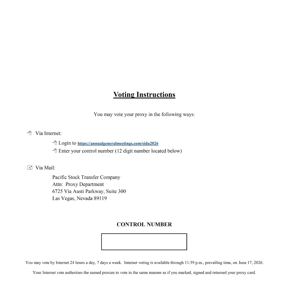 Whether or not you expect to attend the Annual Meeting in person, we urge you to vote your shares at your earliest convenience. This will ensure the presence of a quorum at the Annual Meeting. Promptly voting your shares will save Sidus the expenses and extra work of additional solicitation. An addressed envelope for which no postage is required if mailed in the United States is enclosed if you wish to vote by mail. Submitting your proxy now will not prevent you from voting your shares at the Annual Meeting if you desire to do so, as your proxy is revocable at your option. Your vote is important, so please act today!