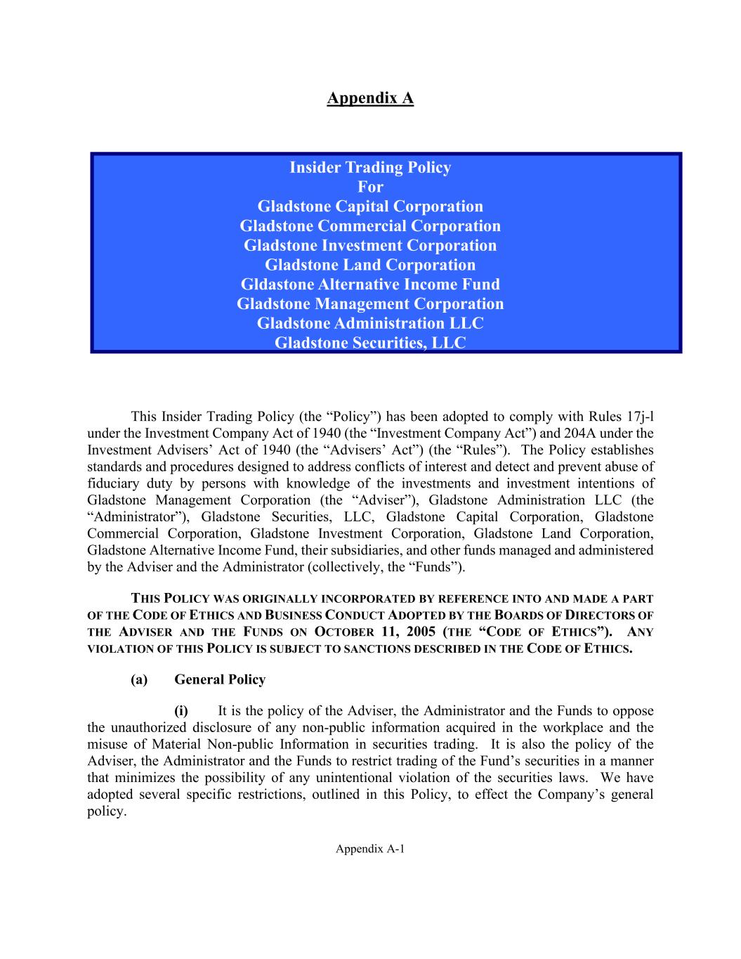 Appendix A-1 Appendix A Insider Trading Policy For Gladstone Capital Corporation Gladstone Commercial Corporation Gladstone Investment Corporation Gladstone Land Corporation Gldastone Alternative Income Fund Gladstone Management Corporation Gladstone Administration LLC Gladstone Securities, LLC and their subsidiaries This Insider Trading Policy (the “Policy”) has been adopted to comply with Rules 17j-l under the Investment Company Act of 1940 (the “Investment Company Act”) and 204A under the Investment Advisers’ Act of 1940 (the “Advisers’ Act”) (the “Rules”). The Policy establishes standards and procedures designed to address conflicts of interest and detect and prevent abuse of fiduciary duty by persons with knowledge of the investments and investment intentions of Gladstone Management Corporation (the “Adviser”), Gladstone Administration LLC (the “Administrator”), Gladstone Securities, LLC, Gladstone Capital Corporation, Gladstone Commercial Corporation, Gladstone Investment Corporation, Gladstone Land Corporation, Gladstone Alternative Income Fund, their subsidiaries, and other funds managed and administered by the Adviser and the Administrator (collectively, the “Funds”). THIS POLICY WAS ORIGINALLY INCORPORATED BY REFERENCE INTO AND MADE A PART OF THE CODE OF ETHICS AND BUSINESS CONDUCT ADOPTED BY THE BOARDS OF DIRECTORS OF THE ADVISER AND THE FUNDS ON OCTOBER 11, 2005 (THE “CODE OF ETHICS”). ANY VIOLATION OF THIS POLICY IS SUBJECT TO SANCTIONS DESCRIBED IN THE CODE OF ETHICS. (a) General Policy (i) It is the policy of the Adviser, the Administrator and the Funds to oppose the unauthorized disclosure of any non-public information acquired in the workplace and the misuse of Material Non-public Information in securities trading. It is also the policy of the Adviser, the Administrator and the Funds to restrict trading of the Fund’s securities in a manner that minimizes the possibility of any unintentional violation of the securities laws. We have adopted several specific restrictions, outlined in this Policy, to effect the Company’s general policy.