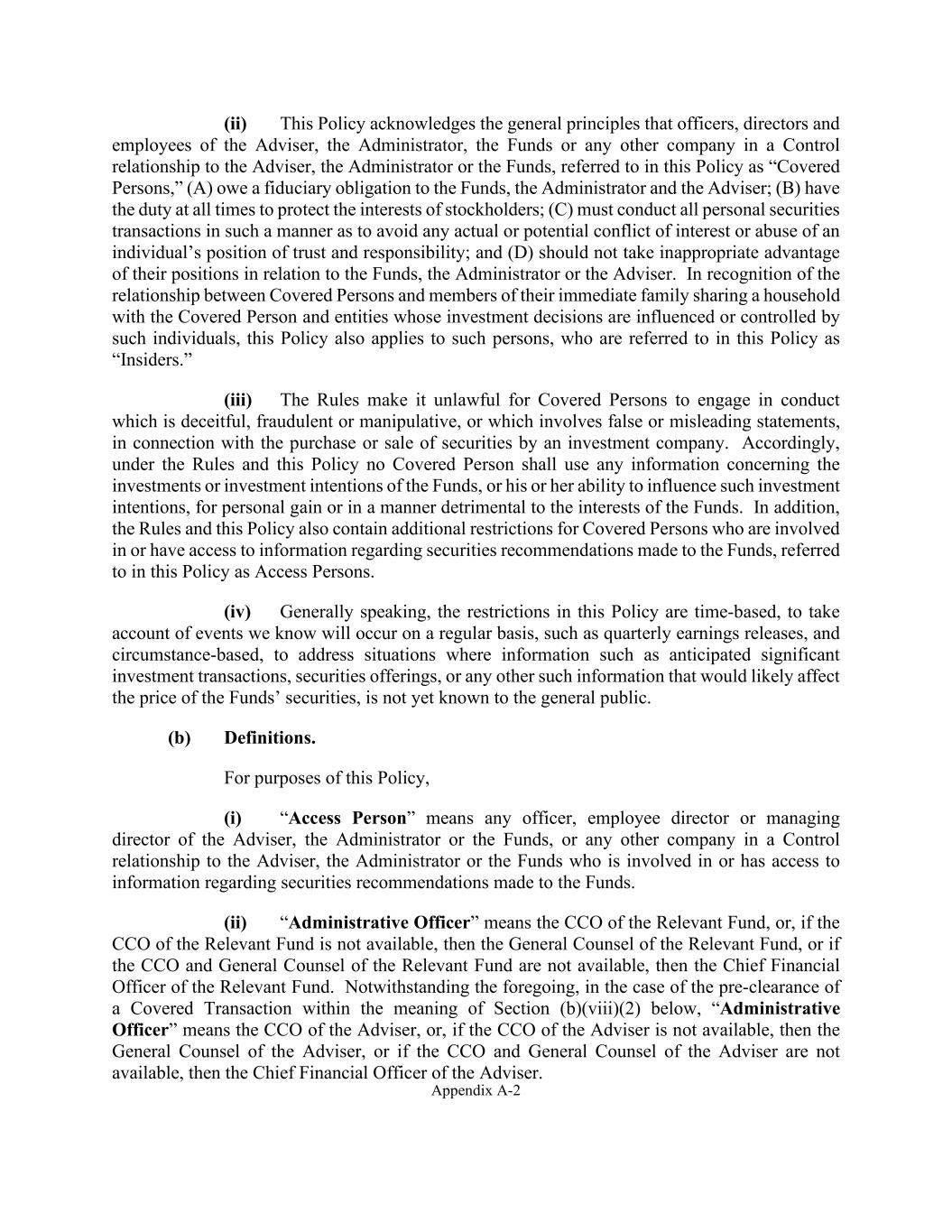 Appendix A-2 (ii) This Policy acknowledges the general principles that officers, directors and employees of the Adviser, the Administrator, the Funds or any other company in a Control relationship to the Adviser, the Administrator or the Funds, referred to in this Policy as “Covered Persons,” (A) owe a fiduciary obligation to the Funds, the Administrator and the Adviser; (B) have the duty at all times to protect the interests of stockholders; (C) must conduct all personal securities transactions in such a manner as to avoid any actual or potential conflict of interest or abuse of an individual’s position of trust and responsibility; and (D) should not take inappropriate advantage of their positions in relation to the Funds, the Administrator or the Adviser. In recognition of the relationship between Covered Persons and members of their immediate family sharing a household with the Covered Person and entities whose investment decisions are influenced or controlled by such individuals, this Policy also applies to such persons, who are referred to in this Policy as “Insiders.” (iii) The Rules make it unlawful for Covered Persons to engage in conduct which is deceitful, fraudulent or manipulative, or which involves false or misleading statements, in connection with the purchase or sale of securities by an investment company. Accordingly, under the Rules and this Policy no Covered Person shall use any information concerning the investments or investment intentions of the Funds, or his or her ability to influence such investment intentions, for personal gain or in a manner detrimental to the interests of the Funds. In addition, the Rules and this Policy also contain additional restrictions for Covered Persons who are involved in or have access to information regarding securities recommendations made to the Funds, referred to in this Policy as Access Persons. (iv) Generally speaking, the restrictions in this Policy are time-based, to take account of events we know will occur on a regular basis, such as quarterly earnings releases, and circumstance-based, to address situations where information such as anticipated significant investment transactions, securities offerings, or any other such information that would likely affect the price of the Funds’ securities, is not yet known to the general public. (b) Definitions. For purposes of this Policy, (i) “Access Person” means any officer, employee director or managing director of the Adviser, the Administrator or the Funds, or any other company in a Control relationship to the Adviser, the Administrator or the Funds who is involved in or has access to information regarding securities recommendations made to the Funds. (ii) “Administrative Officer” means the CCO of the Relevant Fund, or, if the CCO of the Relevant Fund is not available, then the General Counsel of the Relevant Fund, or if the CCO and General Counsel of the Relevant Fund are not available, then the Chief Financial Officer of the Relevant Fund. Notwithstanding the foregoing, in the case of the pre-clearance of a Covered Transaction within the meaning of Section (b)(viii)(2) below, “Administrative Officer” means the CCO of the Adviser, or, if the CCO of the Adviser is not available, then the General Counsel of the Adviser, or if the CCO and General Counsel of the Adviser are not available, then the Chief Financial Officer of the Adviser.