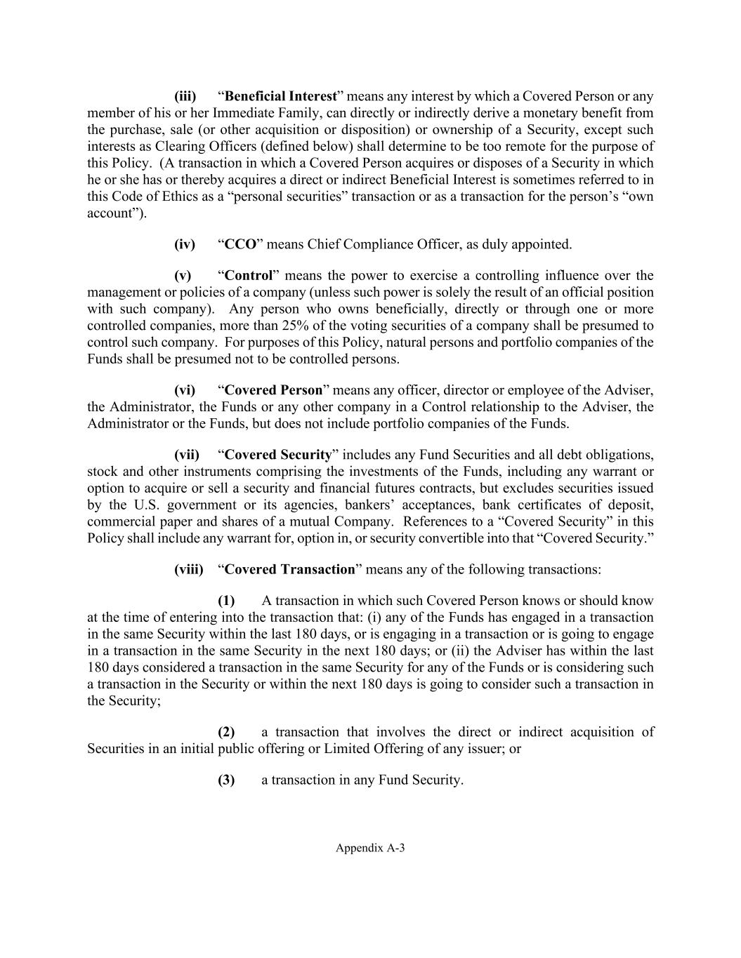 Appendix A-3 (iii) “Beneficial Interest” means any interest by which a Covered Person or any member of his or her Immediate Family, can directly or indirectly derive a monetary benefit from the purchase, sale (or other acquisition or disposition) or ownership of a Security, except such interests as Clearing Officers (defined below) shall determine to be too remote for the purpose of this Policy. (A transaction in which a Covered Person acquires or disposes of a Security in which he or she has or thereby acquires a direct or indirect Beneficial Interest is sometimes referred to in this Code of Ethics as a “personal securities” transaction or as a transaction for the person’s “own account”). (iv) “CCO” means Chief Compliance Officer, as duly appointed. (v) “Control” means the power to exercise a controlling influence over the management or policies of a company (unless such power is solely the result of an official position with such company). Any person who owns beneficially, directly or through one or more controlled companies, more than 25% of the voting securities of a company shall be presumed to control such company. For purposes of this Policy, natural persons and portfolio companies of the Funds shall be presumed not to be controlled persons. (vi) “Covered Person” means any officer, director or employee of the Adviser, the Administrator, the Funds or any other company in a Control relationship to the Adviser, the Administrator or the Funds, but does not include portfolio companies of the Funds. (vii) “Covered Security” includes any Fund Securities and all debt obligations, stock and other instruments comprising the investments of the Funds, including any warrant or option to acquire or sell a security and financial futures contracts, but excludes securities issued by the U.S. government or its agencies, bankers’ acceptances, bank certificates of deposit, commercial paper and shares of a mutual Company. References to a “Covered Security” in this Policy shall include any warrant for, option in, or security convertible into that “Covered Security.” (viii) “Covered Transaction” means any of the following transactions: (1) A transaction in which such Covered Person knows or should know at the time of entering into the transaction that: (i) any of the Funds has engaged in a transaction in the same Security within the last 180 days, or is engaging in a transaction or is going to engage in a transaction in the same Security in the next 180 days; or (ii) the Adviser has within the last 180 days considered a transaction in the same Security for any of the Funds or is considering such a transaction in the Security or within the next 180 days is going to consider such a transaction in the Security; (2) a transaction that involves the direct or indirect acquisition of Securities in an initial public offering or Limited Offering of any issuer; or (3) a transaction in any Fund Security.
