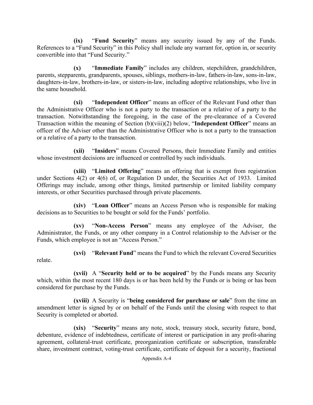 Appendix A-4 (ix) “Fund Security” means any security issued by any of the Funds. References to a “Fund Security” in this Policy shall include any warrant for, option in, or security convertible into that “Fund Security.” (x) “Immediate Family” includes any children, stepchildren, grandchildren, parents, stepparents, grandparents, spouses, siblings, mothers-in-law, fathers-in-law, sons-in-law, daughters-in-law, brothers-in-law, or sisters-in-law, including adoptive relationships, who live in the same household. (xi) “Independent Officer” means an officer of the Relevant Fund other than the Administrative Officer who is not a party to the transaction or a relative of a party to the transaction. Notwithstanding the foregoing, in the case of the pre-clearance of a Covered Transaction within the meaning of Section (b)(viii)(2) below, “Independent Officer” means an officer of the Adviser other than the Administrative Officer who is not a party to the transaction or a relative of a party to the transaction. (xii) “Insiders” means Covered Persons, their Immediate Family and entities whose investment decisions are influenced or controlled by such individuals. (xiii) “Limited Offering” means an offering that is exempt from registration under Sections 4(2) or 4(6) of, or Regulation D under, the Securities Act of 1933. Limited Offerings may include, among other things, limited partnership or limited liability company interests, or other Securities purchased through private placements. (xiv) “Loan Officer” means an Access Person who is responsible for making decisions as to Securities to be bought or sold for the Funds’ portfolio. (xv) “Non-Access Person” means any employee of the Adviser, the Administrator, the Funds, or any other company in a Control relationship to the Adviser or the Funds, which employee is not an “Access Person.” (xvi) “Relevant Fund” means the Fund to which the relevant Covered Securities relate. (xvii) A “Security held or to be acquired” by the Funds means any Security which, within the most recent 180 days is or has been held by the Funds or is being or has been considered for purchase by the Funds. (xviii) A Security is “being considered for purchase or sale” from the time an amendment letter is signed by or on behalf of the Funds until the closing with respect to that Security is completed or aborted. (xix) “Security” means any note, stock, treasury stock, security future, bond, debenture, evidence of indebtedness, certificate of interest or participation in any profit-sharing agreement, collateral-trust certificate, preorganization certificate or subscription, transferable share, investment contract, voting-trust certificate, certificate of deposit for a security, fractional