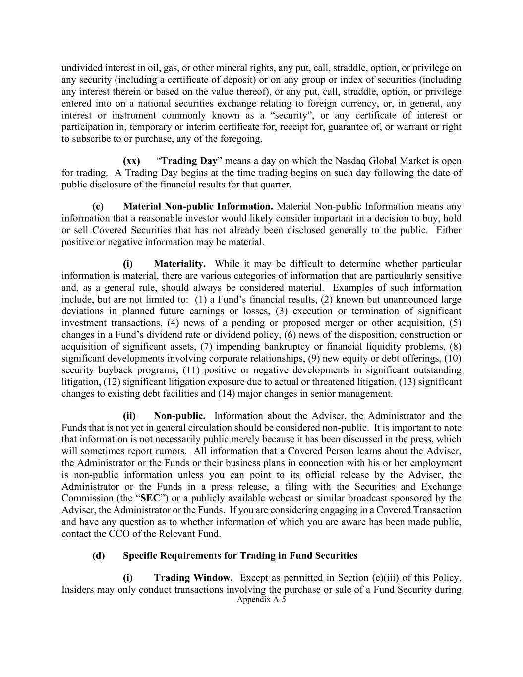Appendix A-5 undivided interest in oil, gas, or other mineral rights, any put, call, straddle, option, or privilege on any security (including a certificate of deposit) or on any group or index of securities (including any interest therein or based on the value thereof), or any put, call, straddle, option, or privilege entered into on a national securities exchange relating to foreign currency, or, in general, any interest or instrument commonly known as a “security”, or any certificate of interest or participation in, temporary or interim certificate for, receipt for, guarantee of, or warrant or right to subscribe to or purchase, any of the foregoing. (xx) “Trading Day” means a day on which the Nasdaq Global Market is open for trading. A Trading Day begins at the time trading begins on such day following the date of public disclosure of the financial results for that quarter. (c) Material Non-public Information. Material Non-public Information means any information that a reasonable investor would likely consider important in a decision to buy, hold or sell Covered Securities that has not already been disclosed generally to the public. Either positive or negative information may be material. (i) Materiality. While it may be difficult to determine whether particular information is material, there are various categories of information that are particularly sensitive and, as a general rule, should always be considered material. Examples of such information include, but are not limited to: (1) a Fund’s financial results, (2) known but unannounced large deviations in planned future earnings or losses, (3) execution or termination of significant investment transactions, (4) news of a pending or proposed merger or other acquisition, (5) changes in a Fund’s dividend rate or dividend policy, (6) news of the disposition, construction or acquisition of significant assets, (7) impending bankruptcy or financial liquidity problems, (8) significant developments involving corporate relationships, (9) new equity or debt offerings, (10) security buyback programs, (11) positive or negative developments in significant outstanding litigation, (12) significant litigation exposure due to actual or threatened litigation, (13) significant changes to existing debt facilities and (14) major changes in senior management. (ii) Non-public. Information about the Adviser, the Administrator and the Funds that is not yet in general circulation should be considered non-public. It is important to note that information is not necessarily public merely because it has been discussed in the press, which will sometimes report rumors. All information that a Covered Person learns about the Adviser, the Administrator or the Funds or their business plans in connection with his or her employment is non-public information unless you can point to its official release by the Adviser, the Administrator or the Funds in a press release, a filing with the Securities and Exchange Commission (the “SEC”) or a publicly available webcast or similar broadcast sponsored by the Adviser, the Administrator or the Funds. If you are considering engaging in a Covered Transaction and have any question as to whether information of which you are aware has been made public, contact the CCO of the Relevant Fund. (d) Specific Requirements for Trading in Fund Securities (i) Trading Window. Except as permitted in Section (e)(iii) of this Policy, Insiders may only conduct transactions involving the purchase or sale of a Fund Security during