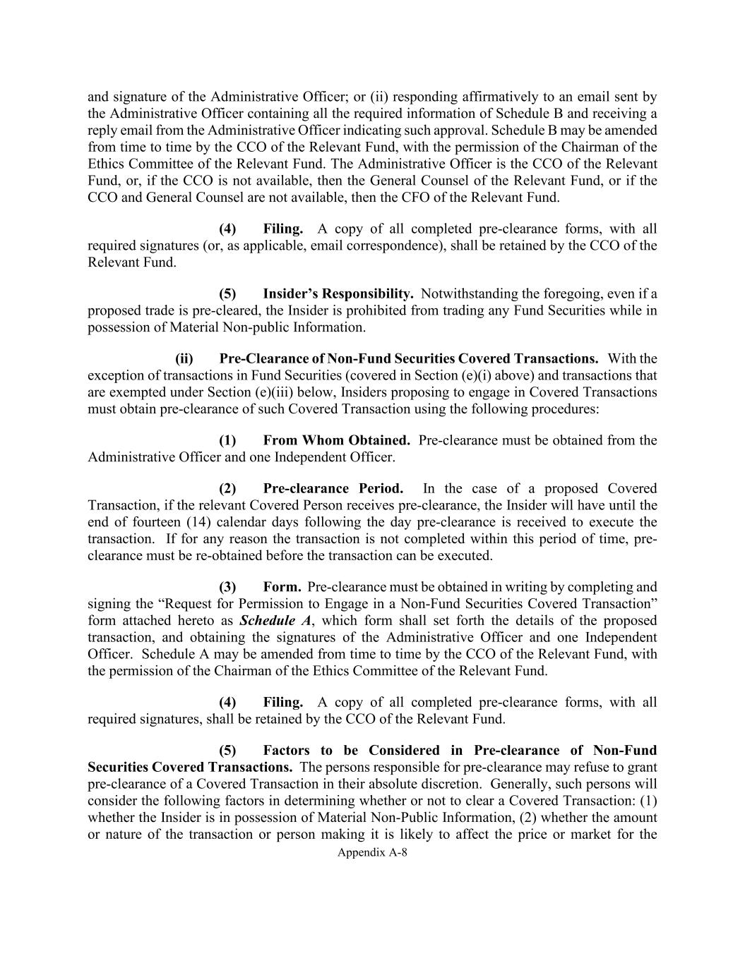 Appendix A-8 and signature of the Administrative Officer; or (ii) responding affirmatively to an email sent by the Administrative Officer containing all the required information of Schedule B and receiving a reply email from the Administrative Officer indicating such approval. Schedule B may be amended from time to time by the CCO of the Relevant Fund, with the permission of the Chairman of the Ethics Committee of the Relevant Fund. The Administrative Officer is the CCO of the Relevant Fund, or, if the CCO is not available, then the General Counsel of the Relevant Fund, or if the CCO and General Counsel are not available, then the CFO of the Relevant Fund. (4) Filing. A copy of all completed pre-clearance forms, with all required signatures (or, as applicable, email correspondence), shall be retained by the CCO of the Relevant Fund. (5) Insider’s Responsibility. Notwithstanding the foregoing, even if a proposed trade is pre-cleared, the Insider is prohibited from trading any Fund Securities while in possession of Material Non-public Information. (ii) Pre-Clearance of Non-Fund Securities Covered Transactions. With the exception of transactions in Fund Securities (covered in Section (e)(i) above) and transactions that are exempted under Section (e)(iii) below, Insiders proposing to engage in Covered Transactions must obtain pre-clearance of such Covered Transaction using the following procedures: (1) From Whom Obtained. Pre-clearance must be obtained from the Administrative Officer and one Independent Officer. (2) Pre-clearance Period. In the case of a proposed Covered Transaction, if the relevant Covered Person receives pre-clearance, the Insider will have until the end of fourteen (14) calendar days following the day pre-clearance is received to execute the transaction. If for any reason the transaction is not completed within this period of time, pre- clearance must be re-obtained before the transaction can be executed. (3) Form. Pre-clearance must be obtained in writing by completing and signing the “Request for Permission to Engage in a Non-Fund Securities Covered Transaction” form attached hereto as Schedule A, which form shall set forth the details of the proposed transaction, and obtaining the signatures of the Administrative Officer and one Independent Officer. Schedule A may be amended from time to time by the CCO of the Relevant Fund, with the permission of the Chairman of the Ethics Committee of the Relevant Fund. (4) Filing. A copy of all completed pre-clearance forms, with all required signatures, shall be retained by the CCO of the Relevant Fund. (5) Factors to be Considered in Pre-clearance of Non-Fund Securities Covered Transactions. The persons responsible for pre-clearance may refuse to grant pre-clearance of a Covered Transaction in their absolute discretion. Generally, such persons will consider the following factors in determining whether or not to clear a Covered Transaction: (1) whether the Insider is in possession of Material Non-Public Information, (2) whether the amount or nature of the transaction or person making it is likely to affect the price or market for the
