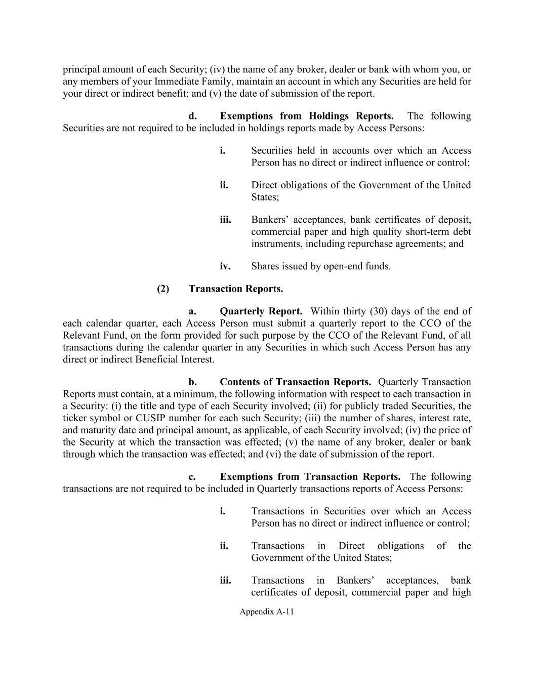 Appendix A-11 principal amount of each Security; (iv) the name of any broker, dealer or bank with whom you, or any members of your Immediate Family, maintain an account in which any Securities are held for your direct or indirect benefit; and (v) the date of submission of the report. d. Exemptions from Holdings Reports. The following Securities are not required to be included in holdings reports made by Access Persons: i. Securities held in accounts over which an Access Person has no direct or indirect influence or control; ii. Direct obligations of the Government of the United States; iii. Bankers’ acceptances, bank certificates of deposit, commercial paper and high quality short-term debt instruments, including repurchase agreements; and iv. Shares issued by open-end funds. (2) Transaction Reports. a. Quarterly Report. Within thirty (30) days of the end of each calendar quarter, each Access Person must submit a quarterly report to the CCO of the Relevant Fund, on the form provided for such purpose by the CCO of the Relevant Fund, of all transactions during the calendar quarter in any Securities in which such Access Person has any direct or indirect Beneficial Interest. b. Contents of Transaction Reports. Quarterly Transaction Reports must contain, at a minimum, the following information with respect to each transaction in a Security: (i) the title and type of each Security involved; (ii) for publicly traded Securities, the ticker symbol or CUSIP number for each such Security; (iii) the number of shares, interest rate, and maturity date and principal amount, as applicable, of each Security involved; (iv) the price of the Security at which the transaction was effected; (v) the name of any broker, dealer or bank through which the transaction was effected; and (vi) the date of submission of the report. c. Exemptions from Transaction Reports. The following transactions are not required to be included in Quarterly transactions reports of Access Persons: i. Transactions in Securities over which an Access Person has no direct or indirect influence or control; ii. Transactions in Direct obligations of the Government of the United States; iii. Transactions in Bankers’ acceptances, bank certificates of deposit, commercial paper and high