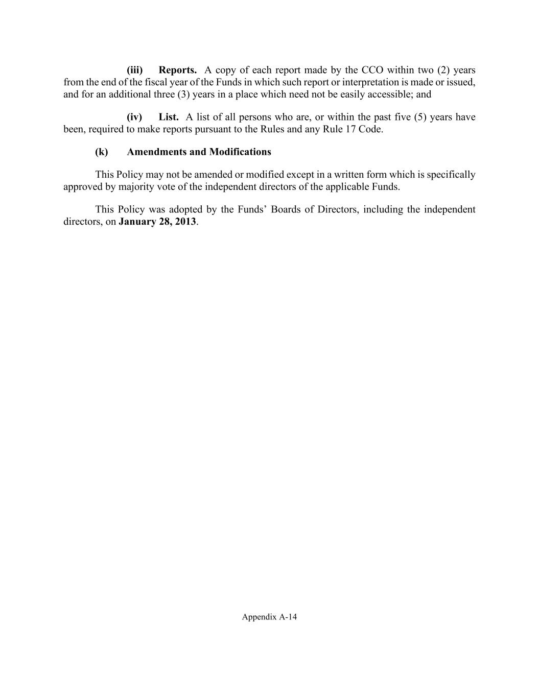 Appendix A-14 (iii) Reports. A copy of each report made by the CCO within two (2) years from the end of the fiscal year of the Funds in which such report or interpretation is made or issued, and for an additional three (3) years in a place which need not be easily accessible; and (iv) List. A list of all persons who are, or within the past five (5) years have been, required to make reports pursuant to the Rules and any Rule 17 Code. (k) Amendments and Modifications This Policy may not be amended or modified except in a written form which is specifically approved by majority vote of the independent directors of the applicable Funds. This Policy was adopted by the Funds’ Boards of Directors, including the independent directors, on January 28, 2013.