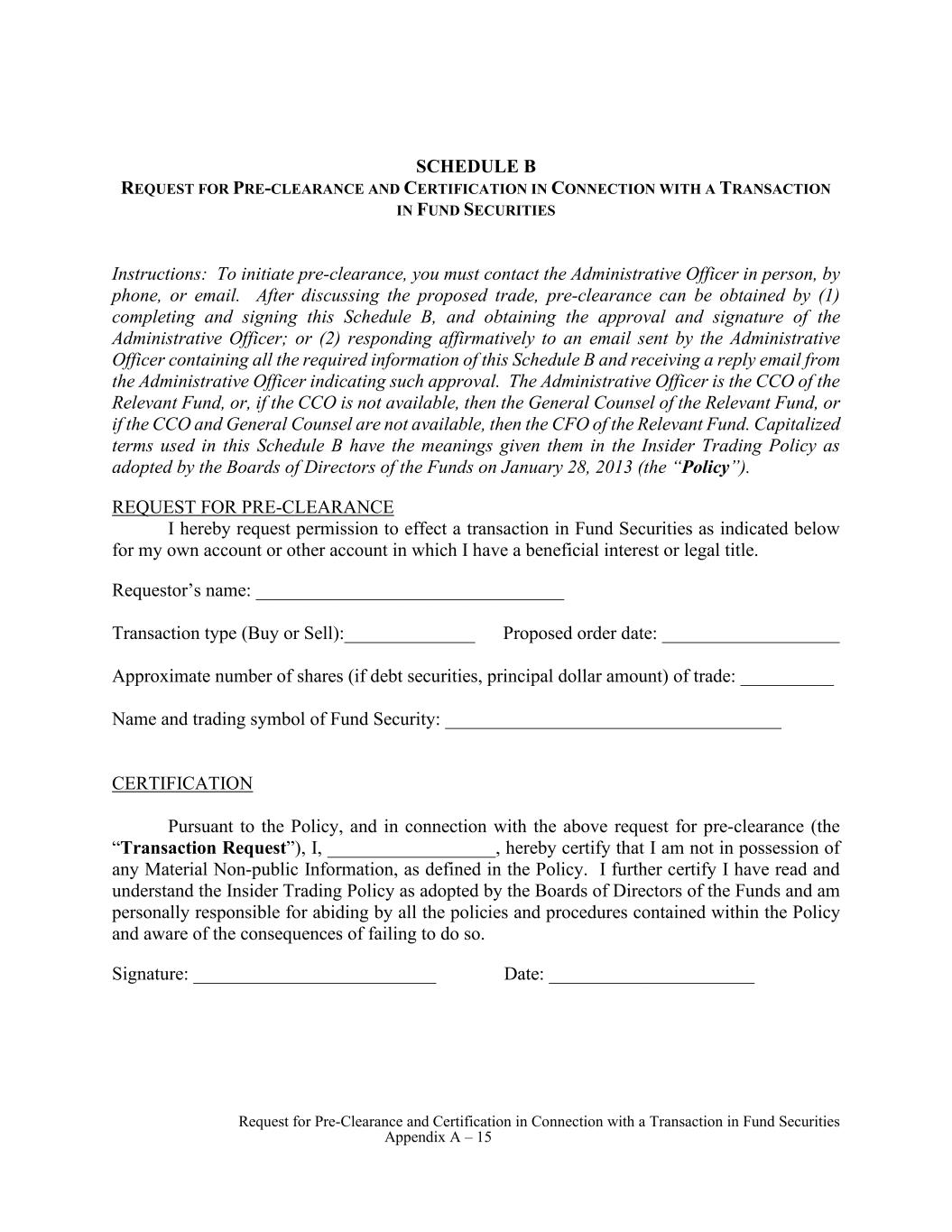 Request for Pre-Clearance and Certification in Connection with a Transaction in Fund Securities Appendix A – 15 SCHEDULE B REQUEST FOR PRE-CLEARANCE AND CERTIFICATION IN CONNECTION WITH A TRANSACTION IN FUND SECURITIES Instructions: To initiate pre-clearance, you must contact the Administrative Officer in person, by phone, or email. After discussing the proposed trade, pre-clearance can be obtained by (1) completing and signing this Schedule B, and obtaining the approval and signature of the Administrative Officer; or (2) responding affirmatively to an email sent by the Administrative Officer containing all the required information of this Schedule B and receiving a reply email from the Administrative Officer indicating such approval. The Administrative Officer is the CCO of the Relevant Fund, or, if the CCO is not available, then the General Counsel of the Relevant Fund, or if the CCO and General Counsel are not available, then the CFO of the Relevant Fund. Capitalized terms used in this Schedule B have the meanings given them in the Insider Trading Policy as adopted by the Boards of Directors of the Funds on January 28, 2013 (the “Policy”). REQUEST FOR PRE-CLEARANCE I hereby request permission to effect a transaction in Fund Securities as indicated below for my own account or other account in which I have a beneficial interest or legal title. Requestor’s name: _________________________________ Transaction type (Buy or Sell):______________ Proposed order date: ___________________ Approximate number of shares (if debt securities, principal dollar amount) of trade: __________ Name and trading symbol of Fund Security: ____________________________________ CERTIFICATION Pursuant to the Policy, and in connection with the above request for pre-clearance (the “Transaction Request”), I, __________________, hereby certify that I am not in possession of any Material Non-public Information, as defined in the Policy. I further certify I have read and understand the Insider Trading Policy as adopted by the Boards of Directors of the Funds and am personally responsible for abiding by all the policies and procedures contained within the Policy and aware of the consequences of failing to do so. Signature: __________________________ Date: ______________________