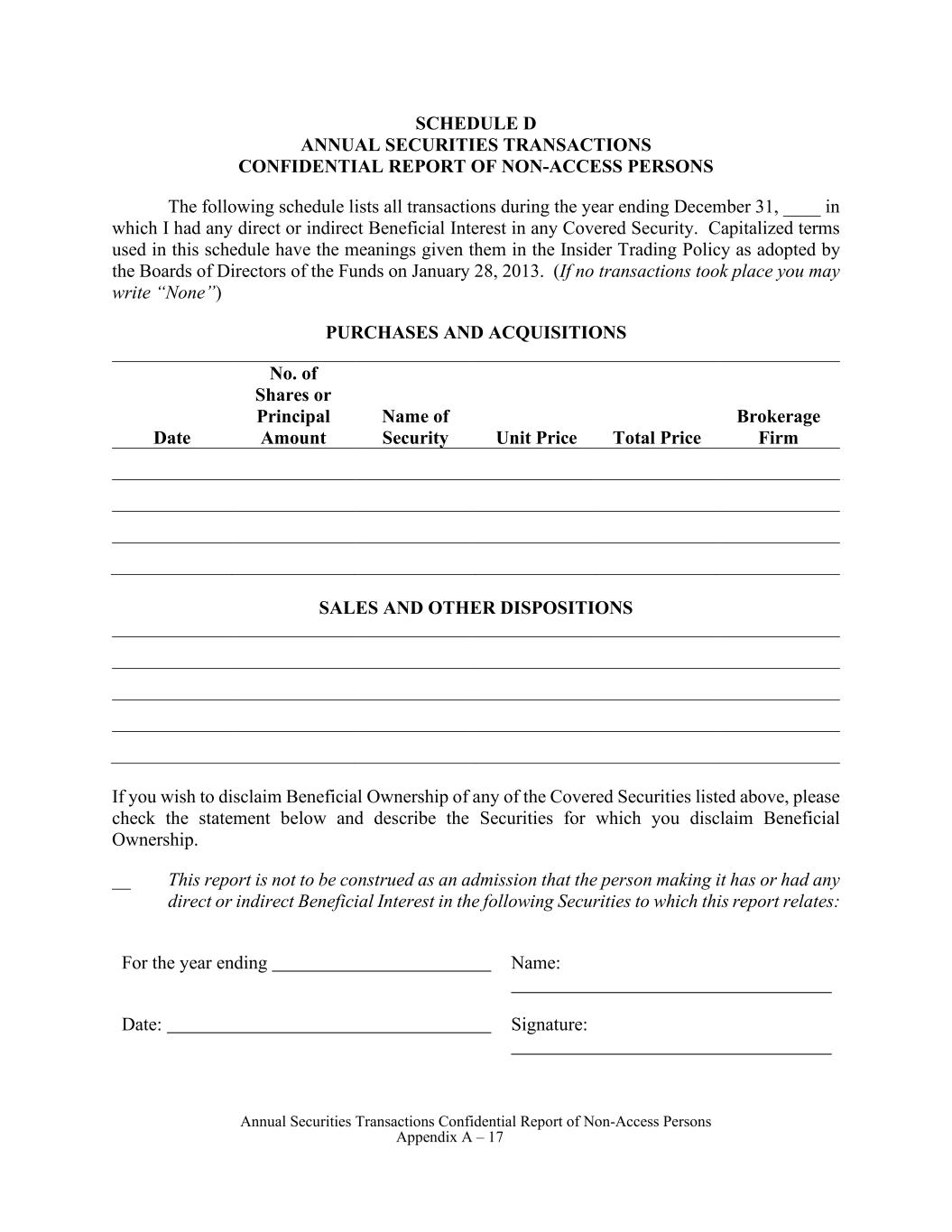 Annual Securities Transactions Confidential Report of Non-Access Persons Appendix A – 17 SCHEDULE D ANNUAL SECURITIES TRANSACTIONS CONFIDENTIAL REPORT OF NON-ACCESS PERSONS The following schedule lists all transactions during the year ending December 31, ____ in which I had any direct or indirect Beneficial Interest in any Covered Security. Capitalized terms used in this schedule have the meanings given them in the Insider Trading Policy as adopted by the Boards of Directors of the Funds on January 28, 2013. (If no transactions took place you may write “None”) PURCHASES AND ACQUISITIONS Date No. of Shares or Principal Amount Name of Security Unit Price Total Price Brokerage Firm SALES AND OTHER DISPOSITIONS If you wish to disclaim Beneficial Ownership of any of the Covered Securities listed above, please check the statement below and describe the Securities for which you disclaim Beneficial Ownership. __ This report is not to be construed as an admission that the person making it has or had any direct or indirect Beneficial Interest in the following Securities to which this report relates: For the year ending Name: Date: Signature: