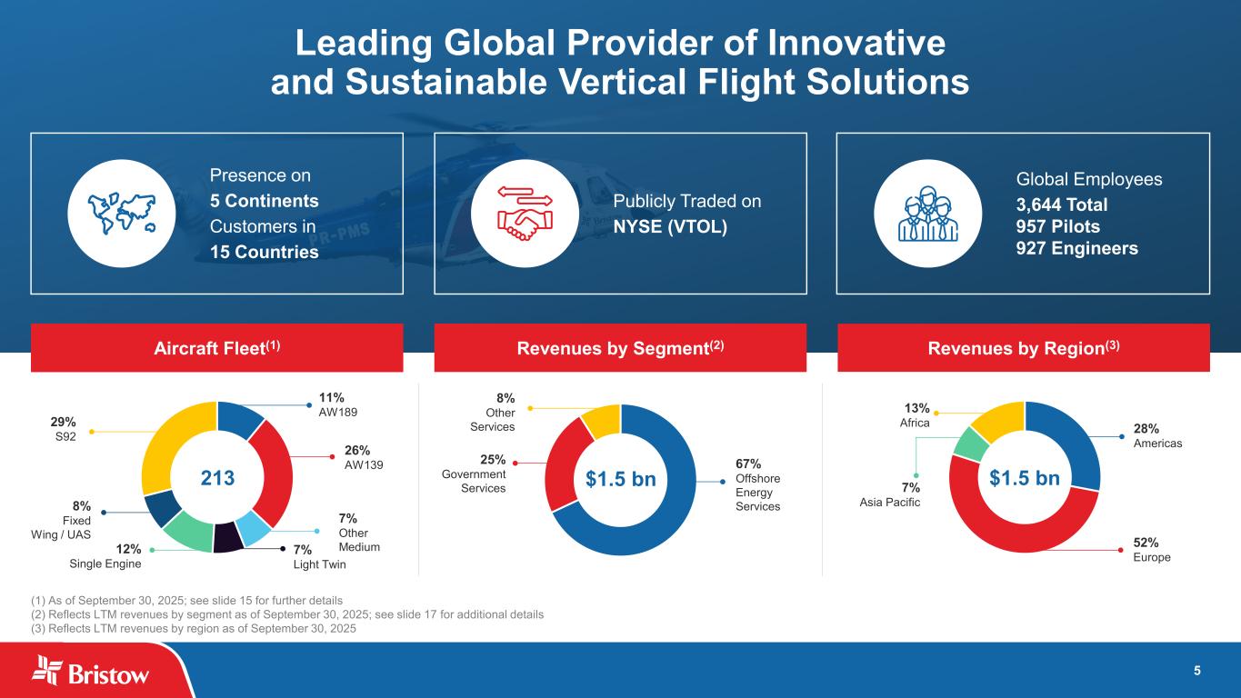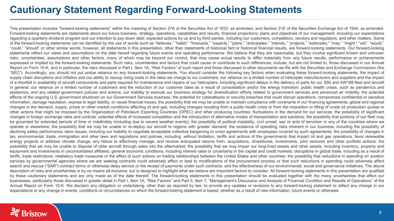 3 Cautionary Statement Regarding Forward-Looking Statements This presentation includes “forward-looking statements” within the meaning of Section 27A of the Securities Act of 1933, as amended, and Section 21E of the Securities Exchange Act of 1934, as amended. Forward-looking statements are statements about our future business, strategy, operations, capabilities and results; financial projections; plans and objectives of our management, including our expectations regarding a quarterly dividend program and our intention to pay down debt; expected actions by us and by third parties, including our customers, competitors, vendors and regulators, and other matters. Some of the forward-looking statements can be identified by the use of words such as “believes,” “belief,” “forecasts,” “expects,” “plans,” “anticipates,” “intends,” “projects,” “estimates,” “may,” “might,” “will,” “would,” “could,” “should” or other similar words; however, all statements in this presentation, other than statements of historical fact or historical financial results, are forward-looking statements. Our forward-looking statements reflect our views and assumptions on the date hereof regarding future events and operating performance. We believe that they are reasonable, but they involve significant known and unknown risks, uncertainties, assumptions and other factors, many of which may be beyond our control, that may cause actual results to differ materially from any future results, performance or achievements expressed or implied by the forward-looking statements. Such risks, uncertainties and factors that could cause or contribute to such differences, include, but are not limited to, those discussed in our Annual Report on Form 10-K, and in particular, the risks discussed in Part I, Item 1A, “Risk Factors” of such report and those discussed in other documents we file with the Securities and Exchange Commission (the “SEC”). Accordingly, you should not put undue reliance on any forward-looking statements. You should consider the following key factors when evaluating these forward-looking statements: the impact of supply chain disruptions and inflation and our ability to recoup rising costs in the rates we charge to our customers; our reliance on a limited number of helicopter manufacturers and suppliers and the impact of a shortfall in availability of aircraft components and parts required for maintenance and repairs of our helicopters, including significant delays in the delivery of parts for our S92 and AW189 fleet and aircraft in general; our reliance on a limited number of customers and the reduction of our customer base as a result of consolidation and/or the energy transition; public health crises, such as pandemics and epidemics, and any related government policies and actions; our inability to execute our business strategy for diversification efforts related to government services and advanced air mobility; the potential effects of the ongoing U.S. government shutdown on our Government Services business; the potential for cyberattacks or security breaches that could disrupt operations, compromise confidential or sensitive information, damage reputation, expose to legal liability, or cause financial losses; the possibility that we may be unable to maintain compliance with covenants in our financing agreements; global and regional changes in the demand, supply, prices or other market conditions affecting oil and gas, including changes resulting from a public health crisis or from the imposition or lifting of crude oil production quotas or other actions that might be imposed by the Organization of Petroleum Exporting Countries (OPEC) and other producing countries; fluctuations in the demand for our services; the possibility of significant changes in foreign exchange rates and controls; potential effects of increased competition and the introduction of alternative modes of transportation and solutions; the possibility that portions of our fleet may be grounded for extended periods of time or indefinitely (including due to severe weather events); the possibility of political instability, civil unrest, war or acts of terrorism in any of the countries where we operate or elsewhere; the possibility that we may be unable to re-deploy our aircraft to regions with greater demand; the existence of operating risks inherent in our business, including the possibility of declining safety performance; labor issues, including our inability to negotiate acceptable collective bargaining or union agreements with employees covered by such agreements; the possibility of changes in tax, environmental, trade, immigration and other laws and regulations and policies, including, without limitation, tariffs and actions of the governments that impact oil and gas operations, favor renewable energy projects or address climate change; any failure to effectively manage, and receive anticipated returns from, acquisitions, divestitures, investments, joint ventures and other portfolio actions; the possibility that we may be unable to dispose of older aircraft through sales into the aftermarket; the possibility that we may impair our long-lived assets and other assets, including inventory, property and equipment and investments in unconsolidated affiliates; general economic conditions, including interest rates or uncertainty in the capital and credit markets; disruptions in global trade, including as a result of tariffs, trade restrictions, retaliatory trade measures or the effect of such actions on trading relationships between the United States and other countries; the possibility that reductions in spending on aviation services by governmental agencies where we are seeking contracts could adversely affect or lead to modifications of the procurement process or that such reductions in spending could adversely affect search and rescue (“SAR”) contract terms or otherwise del