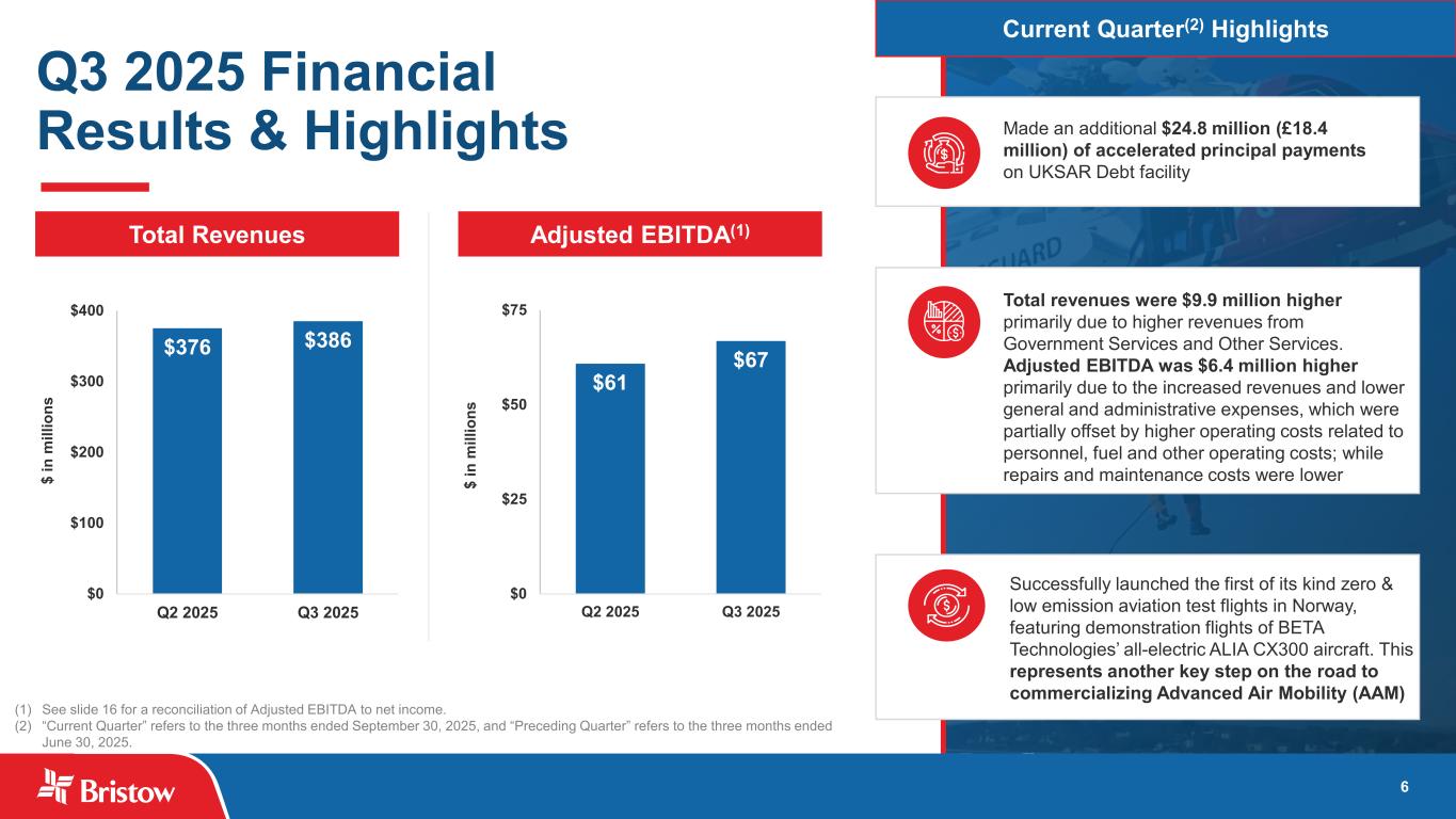 5 7% Light Twin 12% Single Engine 8% Fixed Wing / UAS 29% S92 11% AW189 26% AW139 7% Other Medium 213 Revenues by Segment(2)Aircraft Fleet(1) Revenues by Region(3) Leading Global Provider of Innovative and Sustainable Vertical Flight Solutions Presence on 5 Continents Customers in 15 Countries Publicly Traded on NYSE (VTOL) Global Employees 3,644 Total 957 Pilots 927 Engineers 67% Offshore Energy Services 8% Other Services 25% Government Services $1.5 bn 28% Americas 52% Europe 7% Asia Pacific 13% Africa $1.5 bn (1) As of September 30, 2025; see slide 15 for further details (2) Reflects LTM revenues by segment as of September 30, 2025; see slide 17 for additional details (3) Reflects LTM revenues by region as of September 30, 2025