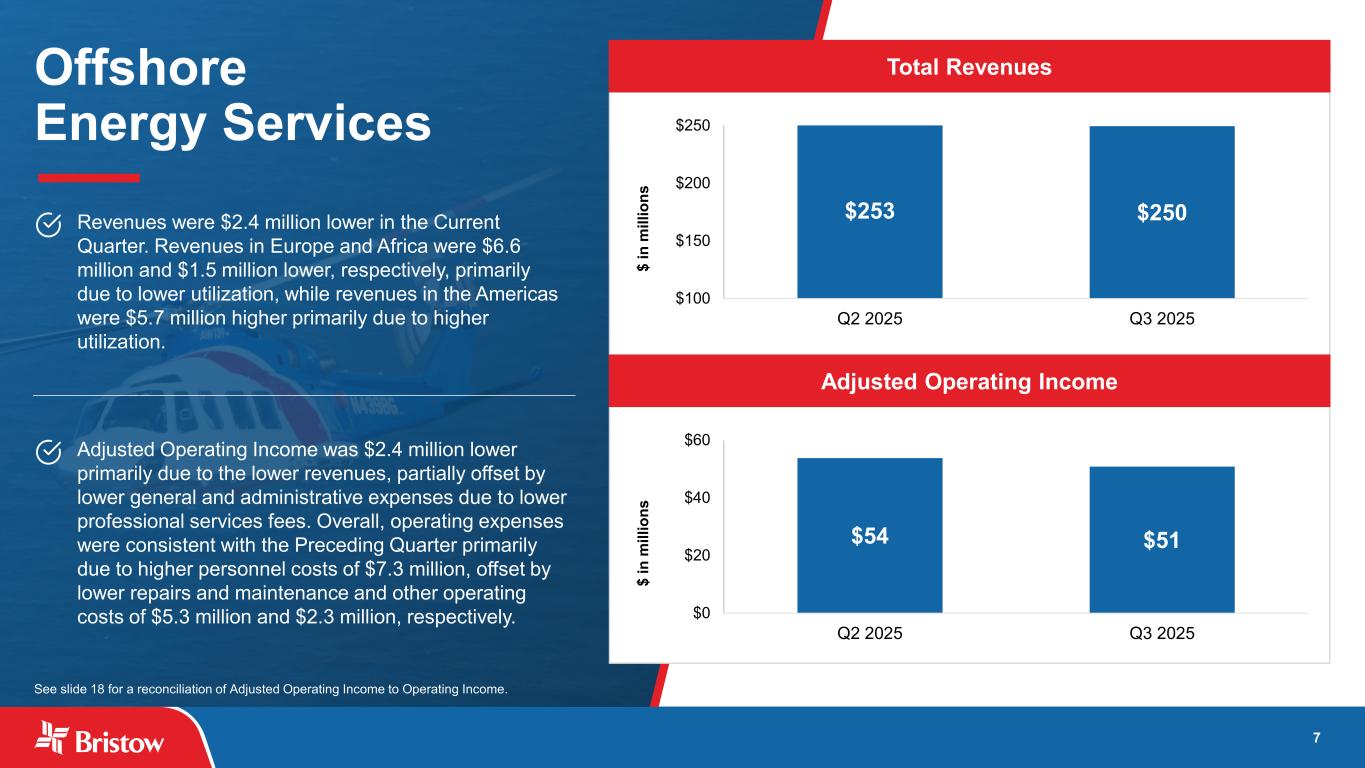6 Q3 2025 Financial Results & Highlights (1) See slide 16 for a reconciliation of Adjusted EBITDA to net income. (2) “Current Quarter” refers to the three months ended 30, 2025, and “Preceding Quarter” refers to the three months ended June 30, 2025. September Made an additional $24.8 million (£18.4 million) of accelerated principal payments on UKSAR Debt facility Total revenues were $9.9 million higher primarily due to higher revenues from Government Services and Other Services. Adjusted EBITDA was $6.4 million higher primarily due to the increased revenues and lower general and administrative expenses, which were partially offset by higher operating costs related to personnel, fuel and other operating costs; while repairs and maintenance costs were lower Successfully launched the first of its kind zero & low emission aviation test flights in Norway, featuring demonstration flights of BETA Technologies’ all-electric ALIA CX300 aircraft. This represents another key step on the road to commercializing Advanced Air Mobility (AAM) $376 $386 $0 $100 $200 $300 $400 Q2 2025 Q3 2025 $ in m ill io ns $61 $67 $0 $25 $50 $75 Q2 2025 Q3 2025 $ in m ill io ns Total Revenues Adjusted EBITDA(1) Current Quarter(2) Highlights