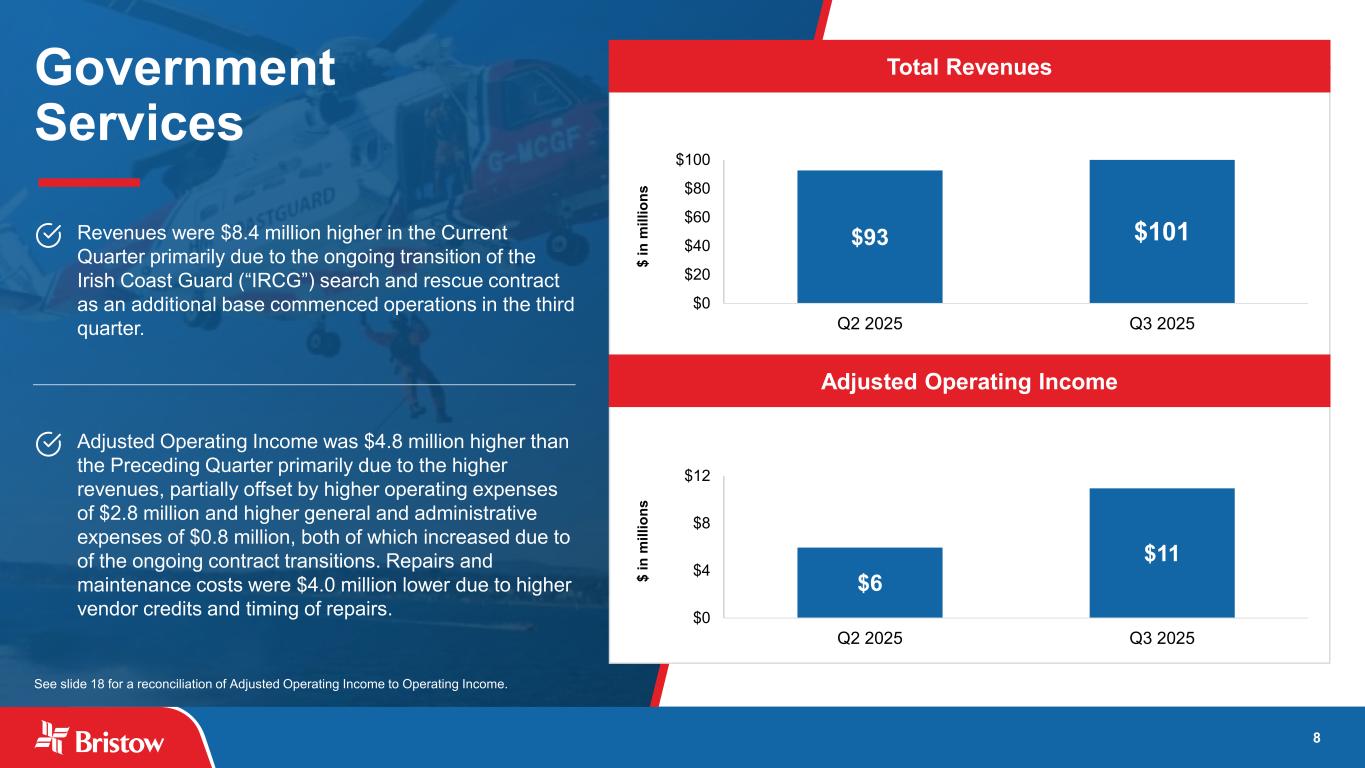 7 Offshore Energy Services Total Revenues Adjusted Operating Income Revenues were $2.4 million lower in the Current Quarter. Revenues in Europe and Africa were $6.6 million and $1.5 million lower, respectively, primarily due to lower utilization, while revenues in the Americas were $5.7 million higher primarily due to higher utilization. Adjusted Operating Income was $2.4 million lower primarily due to the lower revenues, partially offset by lower general and administrative expenses due to lower professional services fees. Overall, operating expenses were consistent with the Preceding Quarter primarily due to higher personnel costs of $7.3 million, offset by lower repairs and maintenance and other operating costs of $5.3 million and $2.3 million, respectively. $54 $51 $0 $20 $40 $60 Q2 2025 Q3 2025 $ in m ill io ns $253 $250 $100 $150 $200 $250 Q2 2025 Q3 2025 $ in m ill io ns See slide 18 for a reconciliation of Adjusted Operating Income to Operating Income.