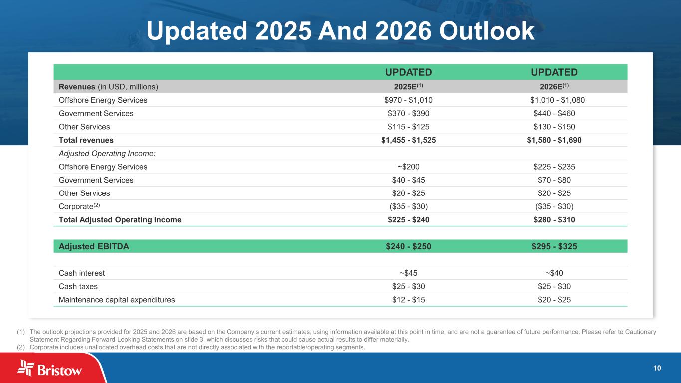 9 Other Services Total Revenues Adjusted Operating Income Adjusted Operating Income was $1.9 million higher in the Current Quarter primarily due to higher revenues, partially offset by higher operating expenses of $1.9 million related to increased activity in Australia. $6 $8 $0 $2 $4 $6 $8 $10 Q2 2025 Q3 2025 $ in m ill io ns $31 $35 $0 $10 $20 $30 $40 Q2 2025 Q3 2025 $ in m ill io ns See slide 18 for a reconciliation of Adjusted Operating Income to Operating Income. Revenues from Other Services were $3.8 million higher in the Current Quarter primarily due to higher activity in Australia of $4.8 million, partially offset by lower revenues of $1.1 million due to the conclusion of a dry-lease contract.