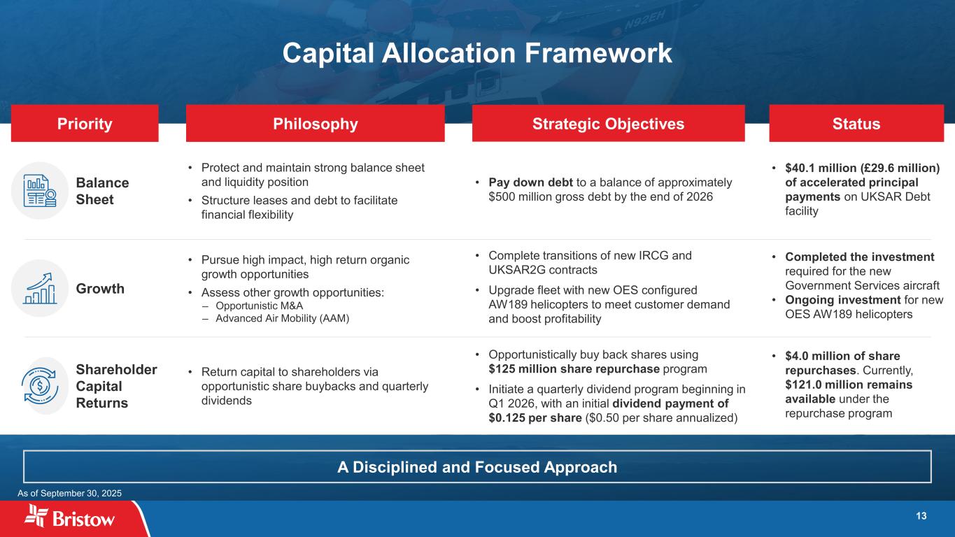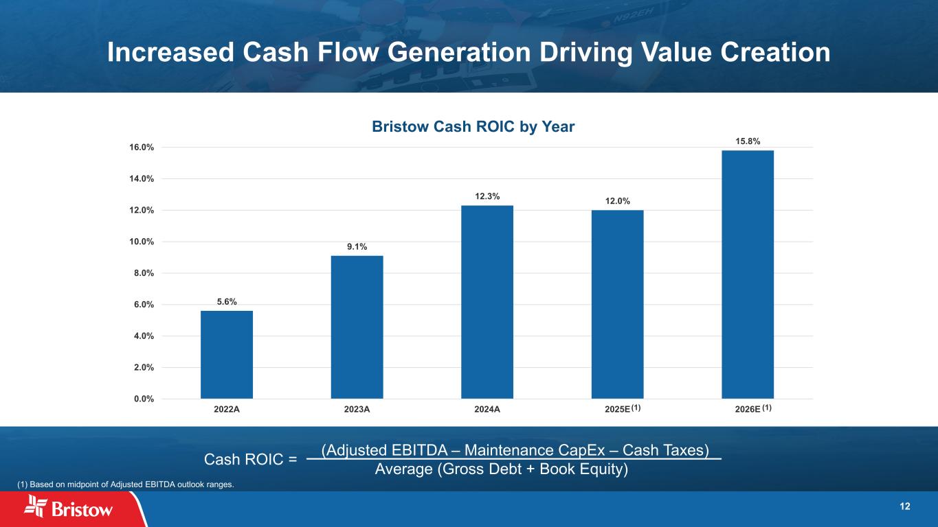 12 (Adjusted EBITDA – Maintenance CapEx – Cash Taxes) Average (Gross Debt + Book Equity) Increased Cash Flow Generation Driving Value Creation (1) Based on midpoint of Adjusted EBITDA outlook ranges. 5.6% 9.1% 12.3% 12.0% 15.8% 0.0% 2.0% 4.0% 6.0% 8.0% 10.0% 12.0% 14.0% 16.0% 2022A 2023A 2024A 2025E 2026E Bristow Cash ROIC by Year (1) (1) Cash ROIC =